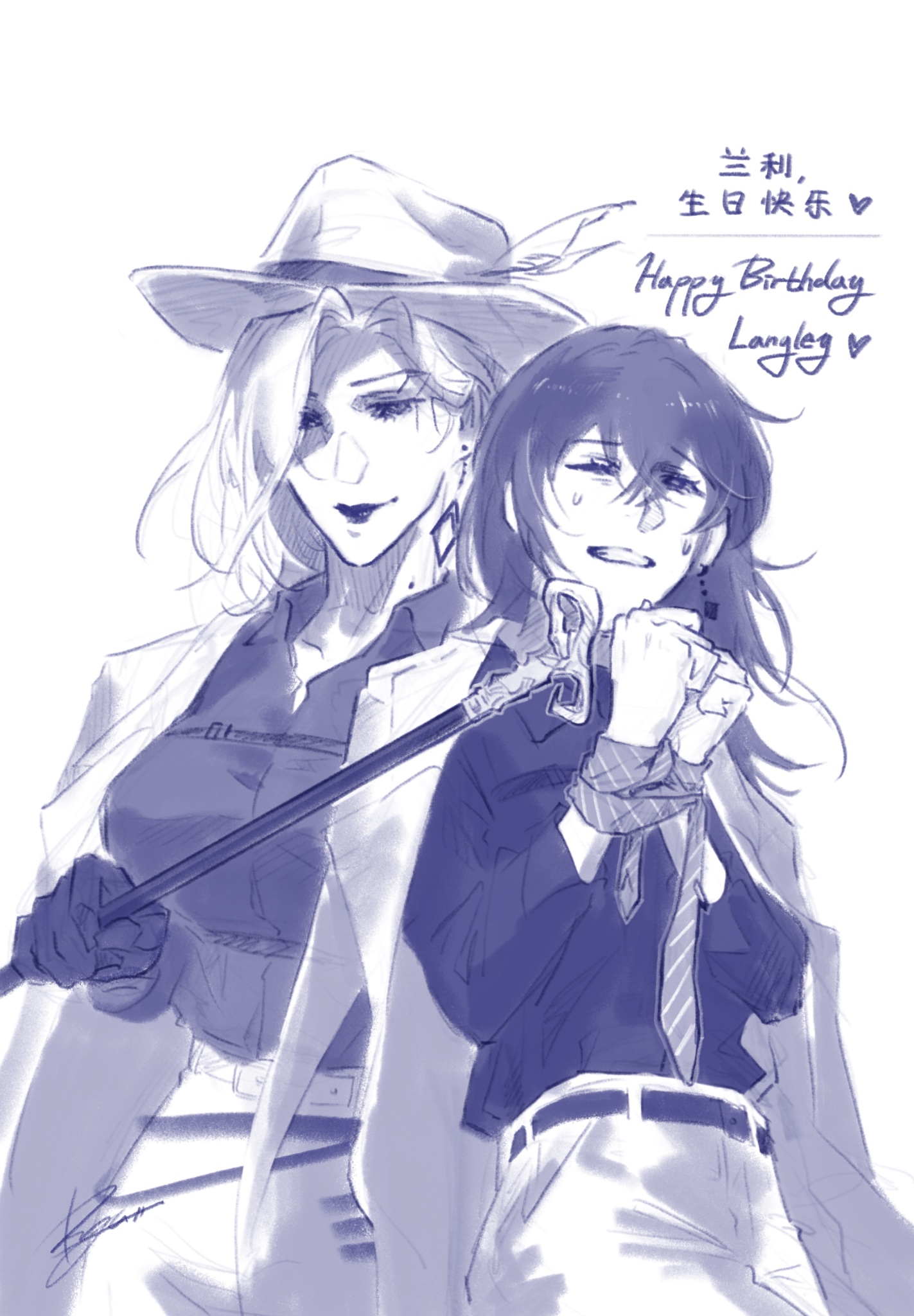 2girls cane chief_(path_to_nowhere) choryu_desu clenched_teeth commentary_request female_chief_(path_to_nowhere) hat highres holding holding_cane korean_commentary langley_(path_to_nowhere) monochrome multiple_girls necktie_around_wrists one_eye_closed path_to_nowhere restrained smile teeth white_background