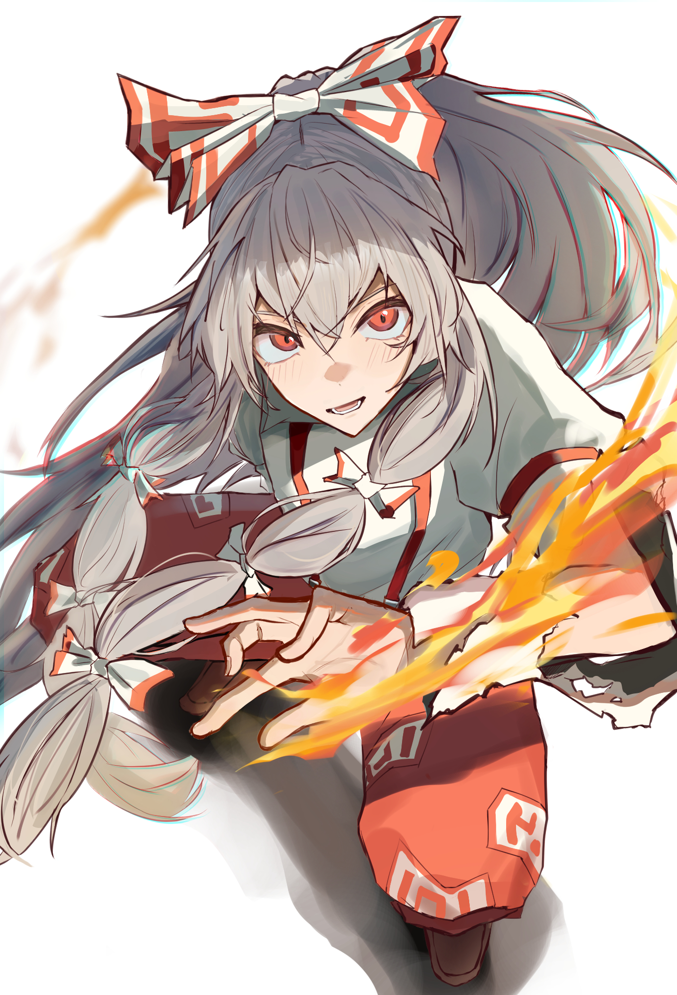 1girl armband bow commentary crossed_bangs fire fujiwara_no_mokou hair_bow highres long_hair looking_at_viewer open_mouth pants red_armband red_eyes red_pants shirt solo squatting suspenders teeth touhou white_hair white_shirt zu_zukan