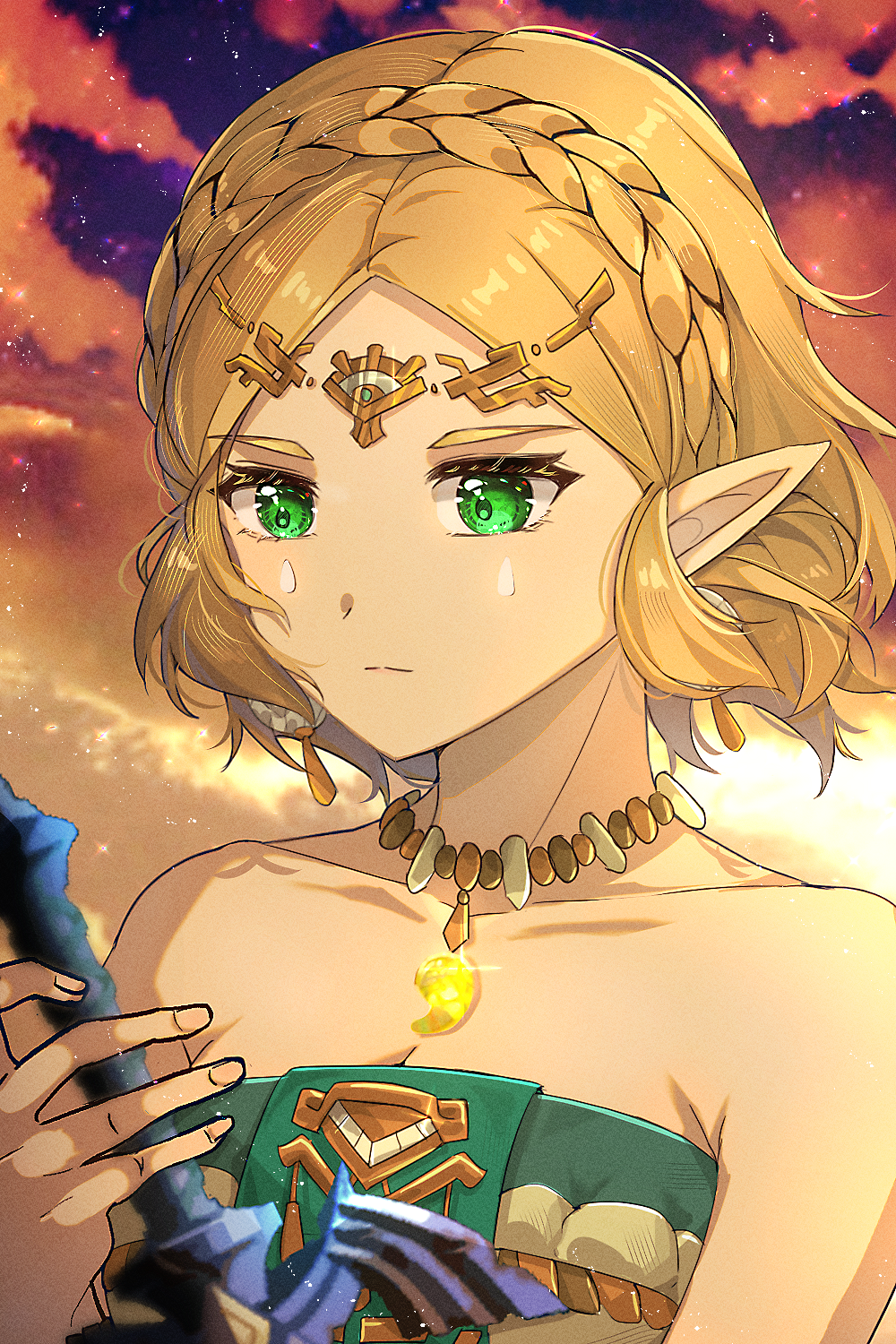 1girl bare_shoulders blonde_hair braid circlet closed_mouth commentary crown_braid dated_commentary dress earrings facial_mark glint gold_circlet green_eyes highres holding holding_sword holding_weapon jewelry looking_at_object magatama magatama_necklace master_sword necklace nintendo parted_bangs pointy_ears portrait princess_zelda short_hair sky solo strapless strapless_dress sword teardrop_facial_mark the_legend_of_zelda the_legend_of_zelda:_tears_of_the_kingdom twilight weapon zer00han