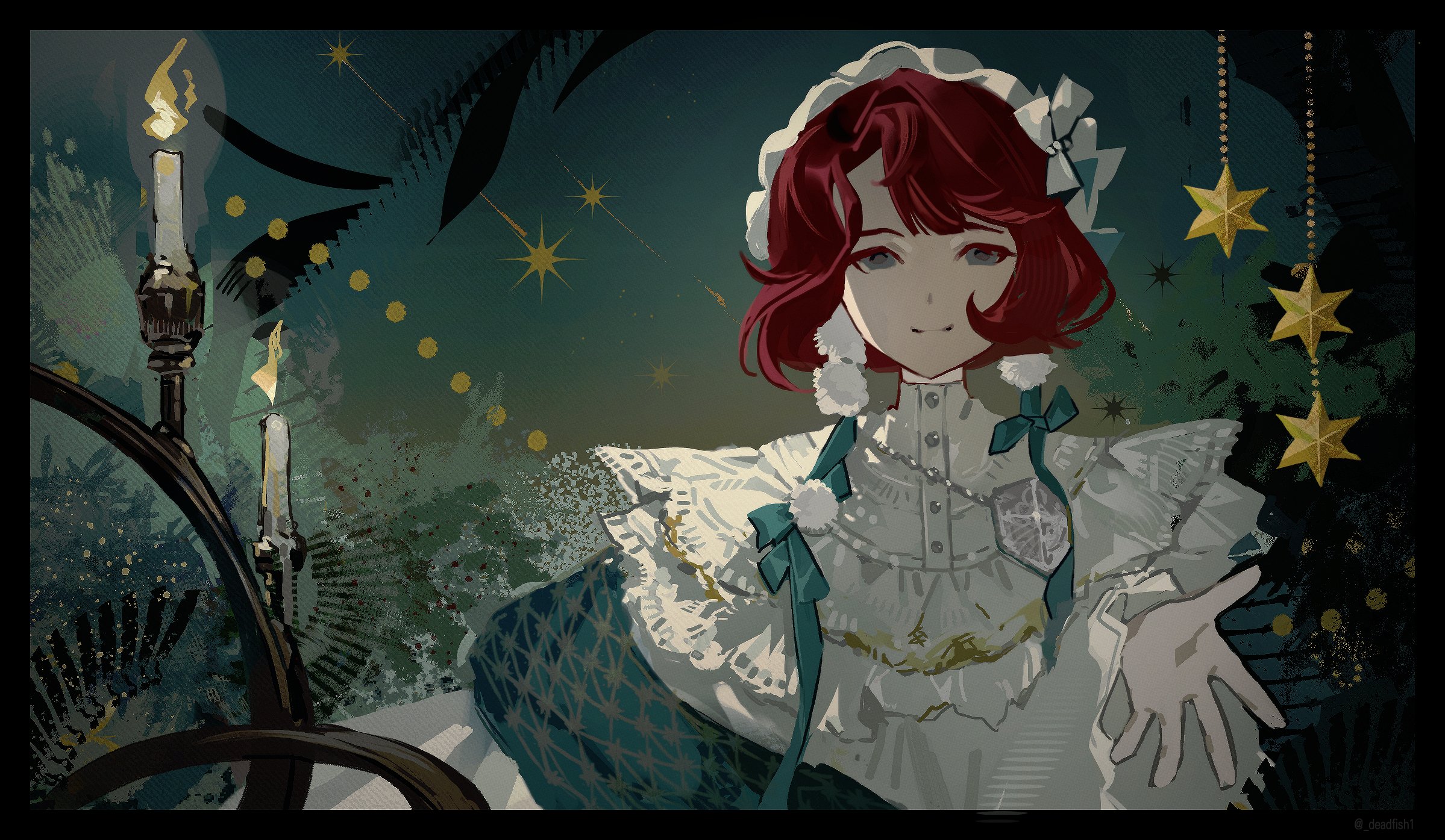 1girl black_border blue_background blue_eyes border candle commentary dress eungo fire hat highres marsha_(reverse:1999) official_alternate_costume outstretched_hand red_hair reverse:1999 solo sparkle upper_body white_dress white_hat