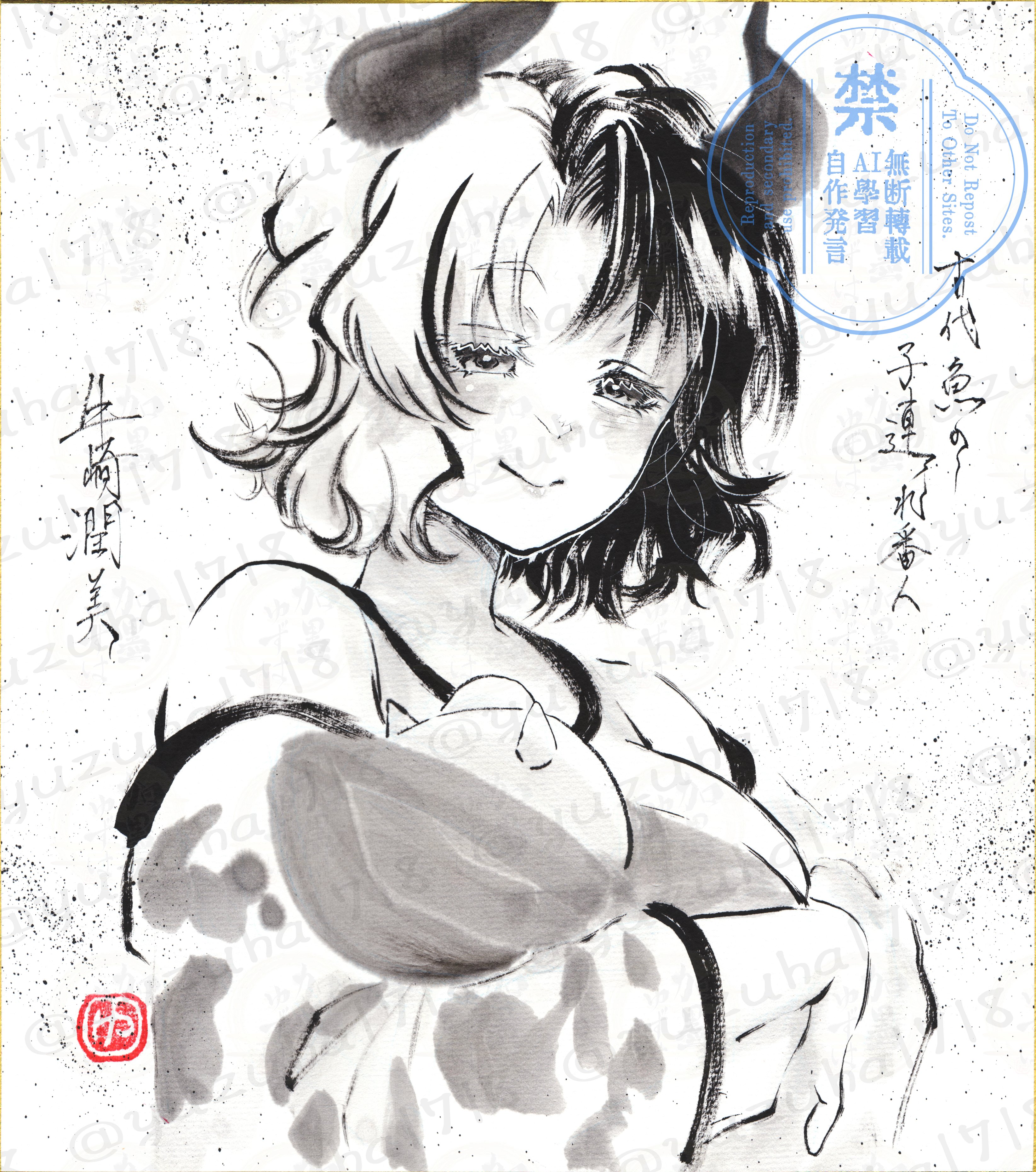 1girl absurdres animal_print closed_mouth commentary cow_girl cow_horns cow_print english_commentary greyscale haori highres horns japanese_clothes monochrome multicolored_hair shikishi short_hair smile solo split-color_hair statue touhou traditional_media translation_request twitter_username two-tone_hair upper_body ushizaki_urumi watermark watermark_grid yuzuha_(yuzutime)