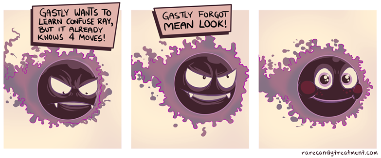 3koma bummerdude comic english_text eye_focus fangs gameplay_mechanics gastly gen_1_pokemon ghost happy looking_at_viewer looking_away nintendo no_humans no_lineart parody pokemon pokemon_(creature) pokemon_move sepia_background simple_background smile watermark web_address
