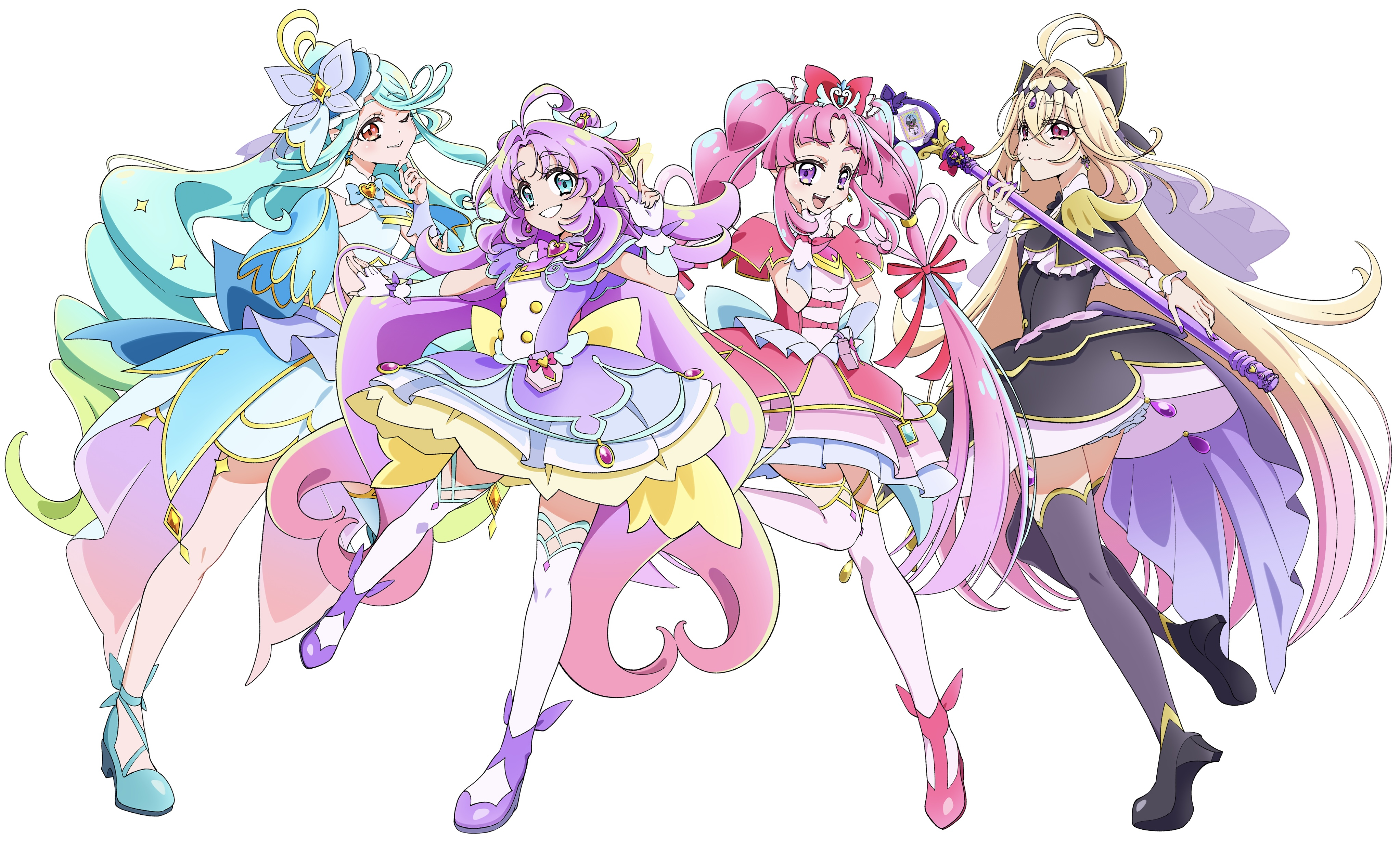 ;) absurdres ahoge akechi_anna ankle_boots antenna_hair aqua_hair aqua_ribbon aqua_shoes aqua_thighhighs back_bow black_boots black_bow black_bowtie black_dress black_thighhighs blonde_hair blue_bow blue_bowtie blue_cape blue_eyes blue_hat blue_skirt boater_hat boots bow bowtie braid brooch butterfly_hat_ornament cape capelet closed_mouth commentary cropped_shirt crown_braid cure_answer cure_arcana_shadow cure_eclair cure_mystique diamond_hairband doraemon12012 double_bun dress drill_hair earrings fingerless_gloves footwear_ribbon frilled_capelet frilled_cuffs frilled_dress frills from_side glove_ribbon gloves gradient_hair green_hair grin hair_bow hair_bun hair_intakes hair_ornament hair_ribbon hand_on_own_chest hand_on_own_chin hand_on_own_elbow hand_on_own_hip hat hat_ornament heart heart_brooch heart_hair_ornament highres holding holding_staff impossible_hair index_finger_raised jewelry kobayashi_mikuru large_bow layered_dress layered_gloves layered_skirt leaning_forward leg_up long_hair looking_at_viewer magical_girl medium_dress meitantei_precure! midriff miniskirt moria_luluka multicolored_hair navel one_eye_closed pact_holder parted_bangs pink_bow pink_bowtie pink_capelet pink_dress pink_hair pink_ribbon pink_shoes precure purple_bow purple_bowtie purple_capelet purple_dress purple_eyes purple_hair purple_ribbon purple_shoes purple_veil red_bow red_eyes red_ribbon ribbon shirt shoes showgirl_skirt side_ponytail simple_background single_thighhigh skirt sleeveless sleeveless_shirt smile staff standing standing_on_one_leg tear_arcana_rod thighhighs tilted_headwear twin_braids veil very_long_hair white_background white_gloves white_shirt white_skirt white_thighhighs wing_hair_ornament yellow_bow