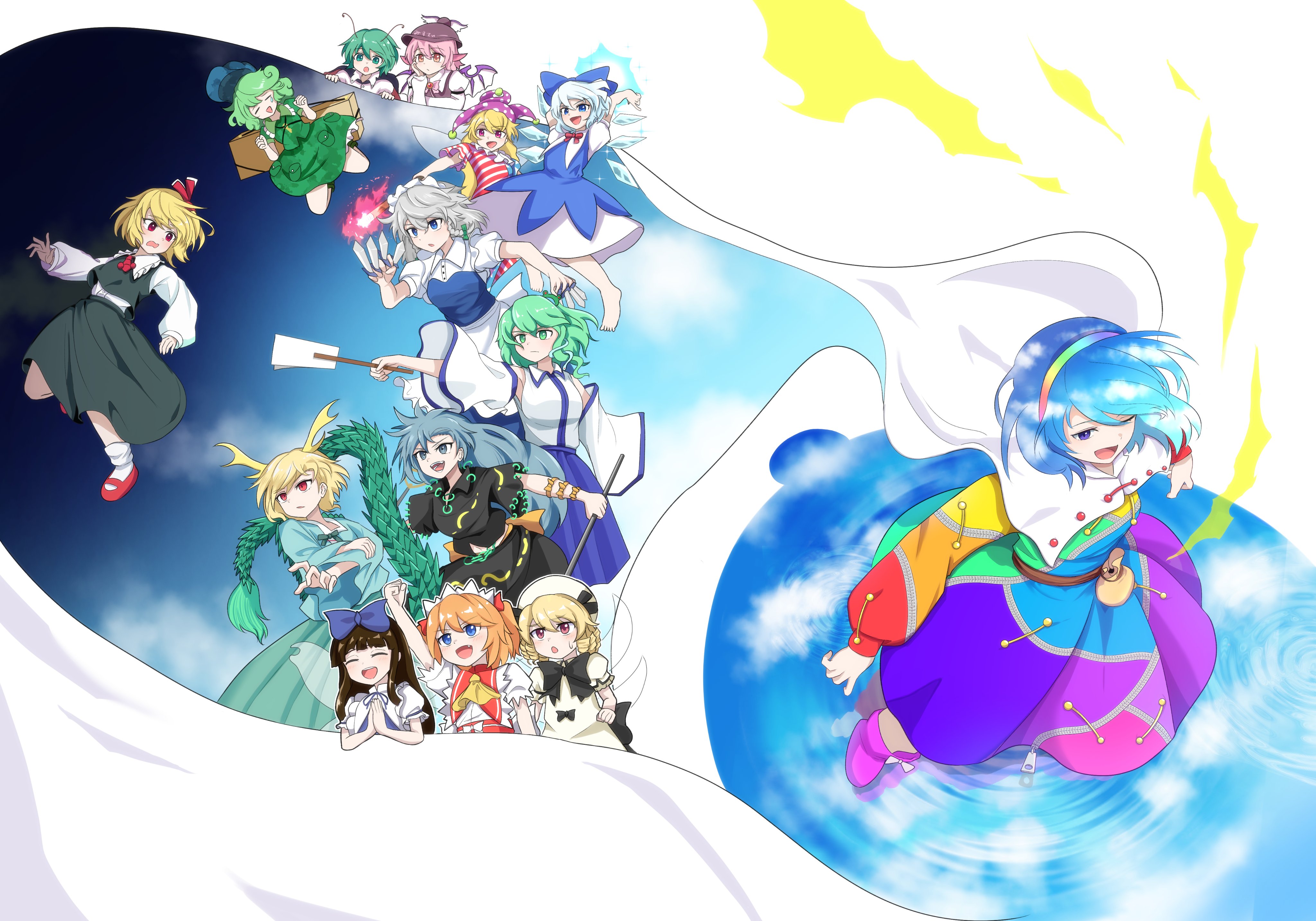 6+girls absurdres american_flag_dress animal_ears antennae antlers apron ascot between_fingers bird_ears black_cape black_shirt black_skirt black_vest blonde_hair blue_bow blue_dress blue_eyes blue_hair blue_hat blue_ribbon blue_shirt blue_skirt bow braid brown_hat camouflage camouflage_shirt camouflage_skirt cape cirno clenched_hand clownpiece collared_shirt commentary_request detached_sleeves detached_wings dragon_girl dragon_horns dragon_tail dress drill_hair fairy fairy_wings fang frilled_shirt_collar frills frog_hair_ornament fur-tipped_tail green_bow green_hair green_shirt green_skirt green_tail grey_hair guminemi hair_bow hair_ornament hair_ribbon hairband hand_on_own_cheek hand_on_own_face hat highres himemushi_momoyo holding holding_knife holding_torch horns ice ice_wings izayoi_sakuya jester_cap jewelry key key_necklace kicchou_yachie knife knives_between_fingers kochiya_sanae long_hair long_sleeves luna_child maid maid_headdress mary_janes multicolored_dress multicolored_hairband multiple_girls multiple_wings mystia_lorelei neck_ribbon neck_ruff necklace open_mouth orange_hair own_hands_together palms_together patchwork_clothes pinafore_dress pink_hair polka_dot polka_dot_headwear puffy_short_sleeves puffy_sleeves purple_eyes purple_hat rainbow_gradient rainbow_hairband red_eyes red_ribbon red_shoes ribbon ripples rumia shirt shoes short_sleeves skirt skirt_set sky_print sleeveless sleeveless_dress smile snake_hair_ornament socks star_(symbol) star_print star_sapphire sunny_milk sweatdrop tail tenkyuu_chimata torch touhou turtle_shell twin_braids vest waist_apron white_cape white_dress white_hat white_shirt white_socks winged_hat wings wriggle_nightbug yamashiro_takane yellow_ascot yellow_horns