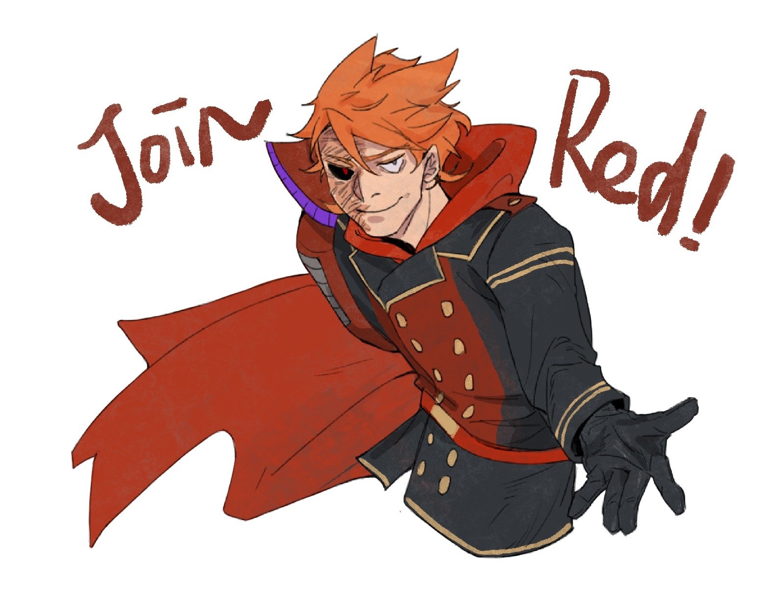 1boy animification antenna_hair belt black_coat black_gloves black_sclera brown_hair burn_scar cape coat colored_sclera commentary cyborg eddsworld english_text gloves hair_ears highres hood hood_down hooded_cape lin_hei_tao long_sleeves male_focus mechanical_arms military_coat military_uniform mismatched_sclera outstretched_hand prosthesis prosthetic_arm red_belt red_cape red_hood red_leader_(eddsworld) scar short_hair simple_background single_mechanical_arm smile solo the_beginning_and_the_friend tord_(eddsworld)