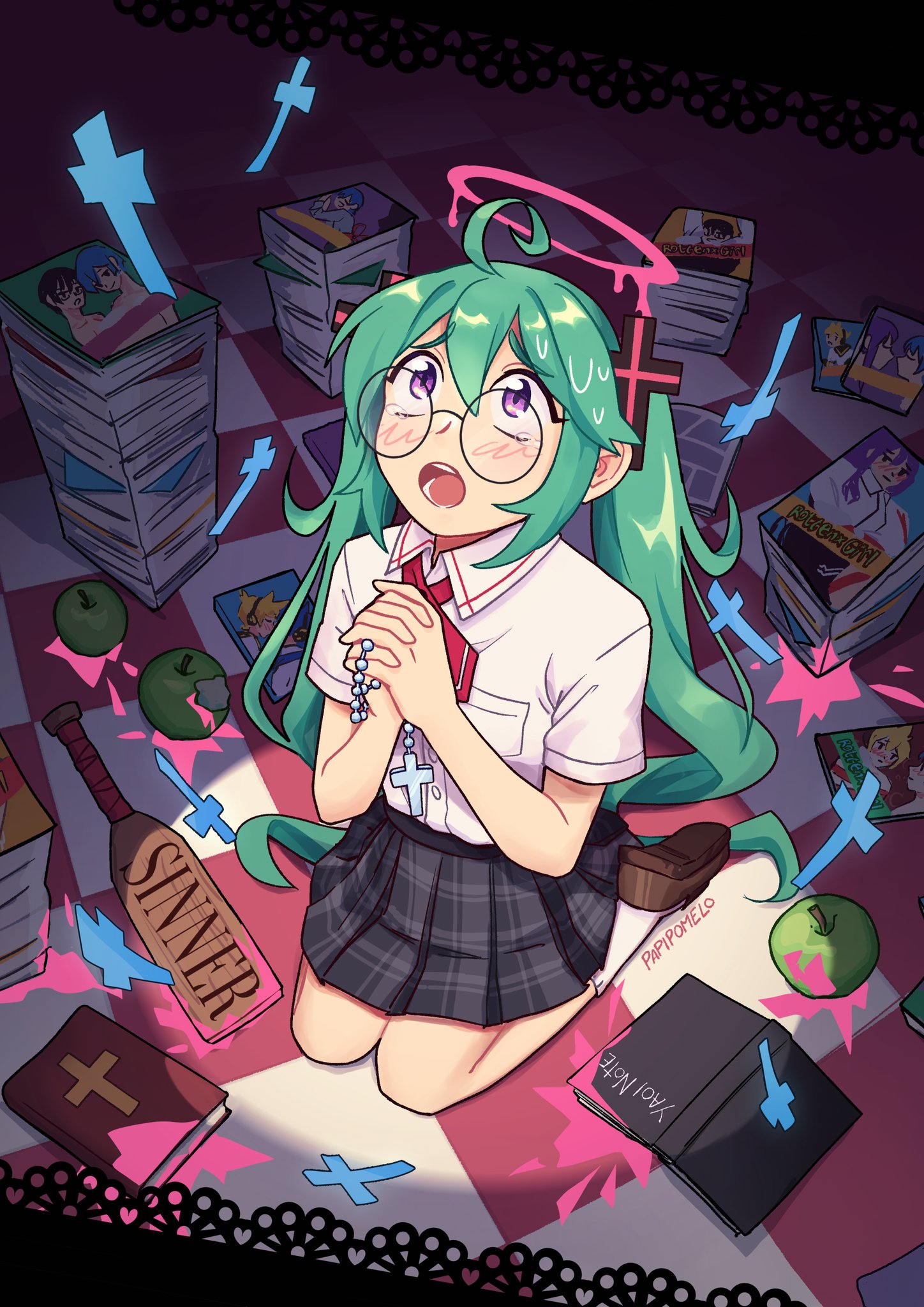 1girl ahoge apple bible_(object) black_skirt blush_stickers book book_stack bow bowtie breast_pocket brown_shoes checkered_floor collared_shirt commentary confessions_of_a_rotten_girl_(vocaloid) cross cross_hair_ornament cross_necklace death_note_(object) english_commentary food fruit fujoshi full_body green_apple green_hair hair_between_eyes hair_ornament halo hatsune_miku highres holding holding_cross jewelry long_hair looking_up melting_halo necklace open_mouth own_hands_together papipomelo penny_loafers pink_halo plaid_clothes plaid_skirt pleated_skirt pocket pornography praying purple_eyes raised_inner_eyebrows red_bow red_bowtie round_eyewear seiza shirt shirt_tucked_in shoes sidelocks sitting skirt socks solo spotlight tears twintails twitter_username vocaloid white_shirt white_socks yaoi_(object)
