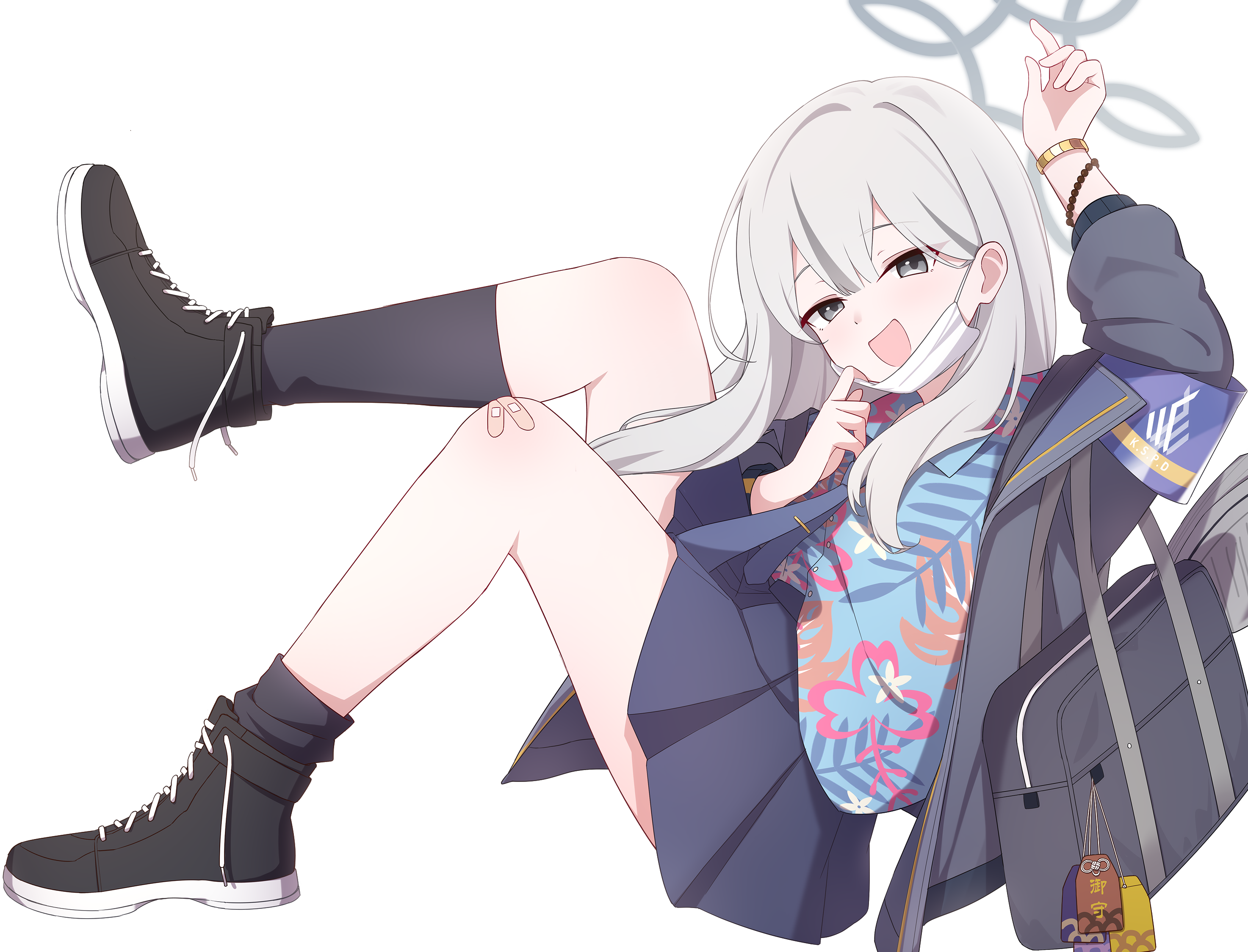 1girl armband aticsanir bag bandaid bandaid_on_knee bandaid_on_leg black_jacket black_shoes black_skirt black_socks blue_archive blue_armband blue_shirt commentary floral_print_shirt grey_eyes grey_hair grey_halo halo hawaiian_shirt highres jacket konoka_(blue_archive) long_hair long_sleeves looking_at_viewer mask mask_pull mouth_mask open_clothes open_jacket open_mouth pleated_skirt school_bag shirt shoes simple_background sitting skirt smile sneakers socks solo surgical_mask untied_shoelaces white_background white_mask
