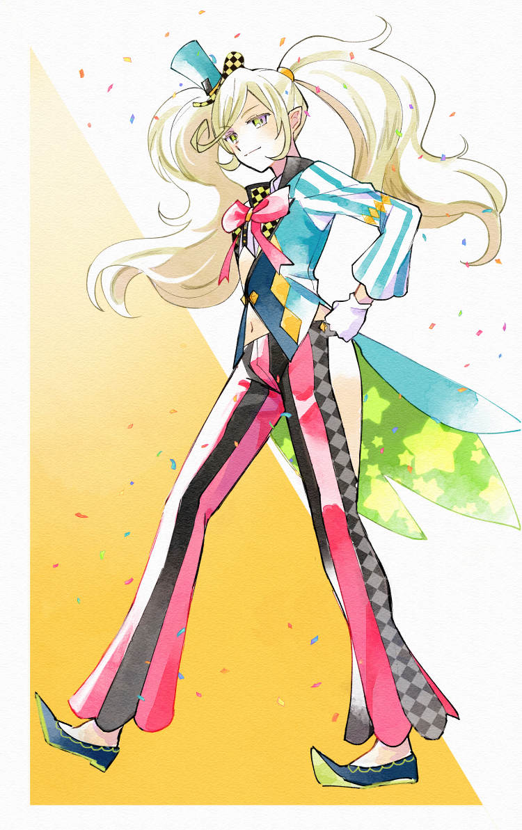 1girl black_pants blonde_hair blue_hat blue_shoes closed_mouth commentary_request confetti enoki_(megaclam) full_body gloves green_eyes hand_on_own_hip hat long_hair looking_at_viewer magician magilou_(magician)_(tales) magilou_(tales) mini_hat mini_top_hat multicolored_pants multicolored_shirt navel official_alternate_costume official_alternate_hairstyle pants pink_pants pink_ribbon pointy_ears ribbon shoes simple_background smile solo standing tales_of_(series) tales_of_berseria top_hat twintails two-tone_background very_long_hair white_background white_gloves yellow_background