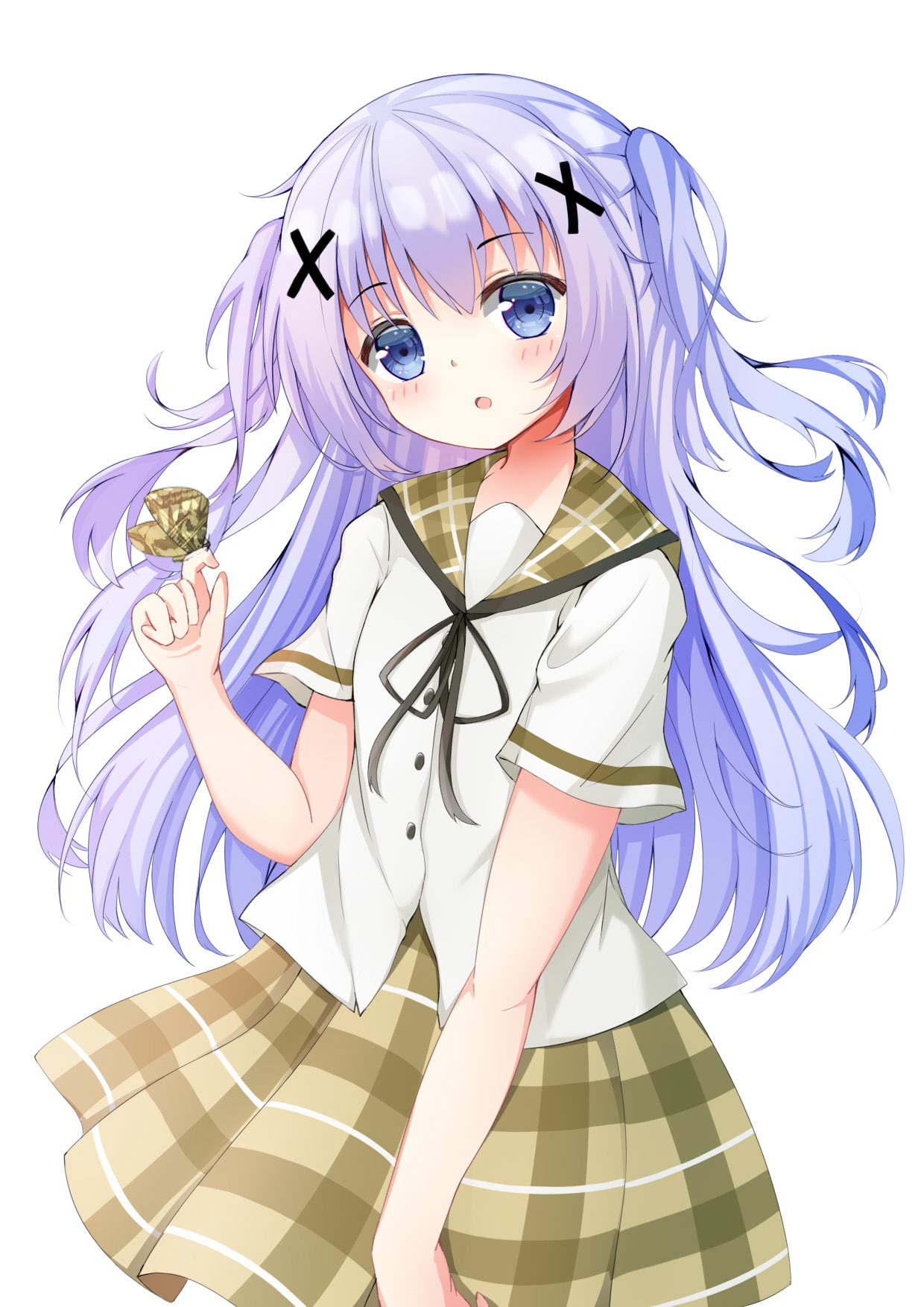 1girl :o black_ribbon blue_eyes blue_hair blush brown_sailor_collar brown_skirt bug butterfly butterfly_on_hand child commentary_request cowboy_shot floating_hair gochuumon_wa_usagi_desu_ka? hair_between_eyes hair_ornament hand_up highres insect kafuu_chino kk0220 long_hair looking_at_viewer open_mouth plaid_clothes plaid_sailor_collar plaid_skirt pleated_skirt ribbon sailor_collar sailor_shirt school_uniform serafuku shirt short_sleeves simple_background skirt solo tareme two_side_up very_long_hair white_background white_shirt x_hair_ornament