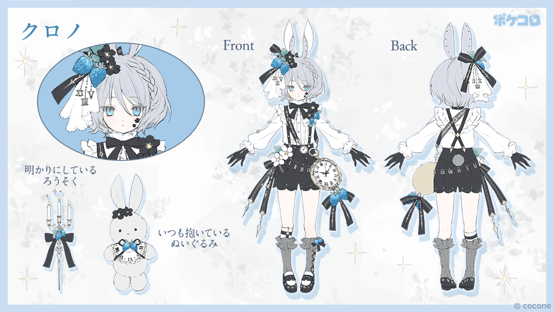 1girl animal_ears black_bow black_flower black_gloves black_shoes black_shorts blue_border blue_eyes border bow braid candelabra candle candlestand clock closed_mouth commentary_request copyright_request english_text fire flower food fruit gloves grey_background grey_hair grey_socks hair_between_eyes hair_flower hair_ornament long_sleeves multiple_views onineko puffy_long_sleeves puffy_sleeves rabbit_ears rabbit_girl rabbit_tail reference_sheet roman_numeral shirt shoes shorts socks standing strawberry stuffed_animal stuffed_rabbit stuffed_toy suspender_shorts suspenders tail translation_request white_shirt