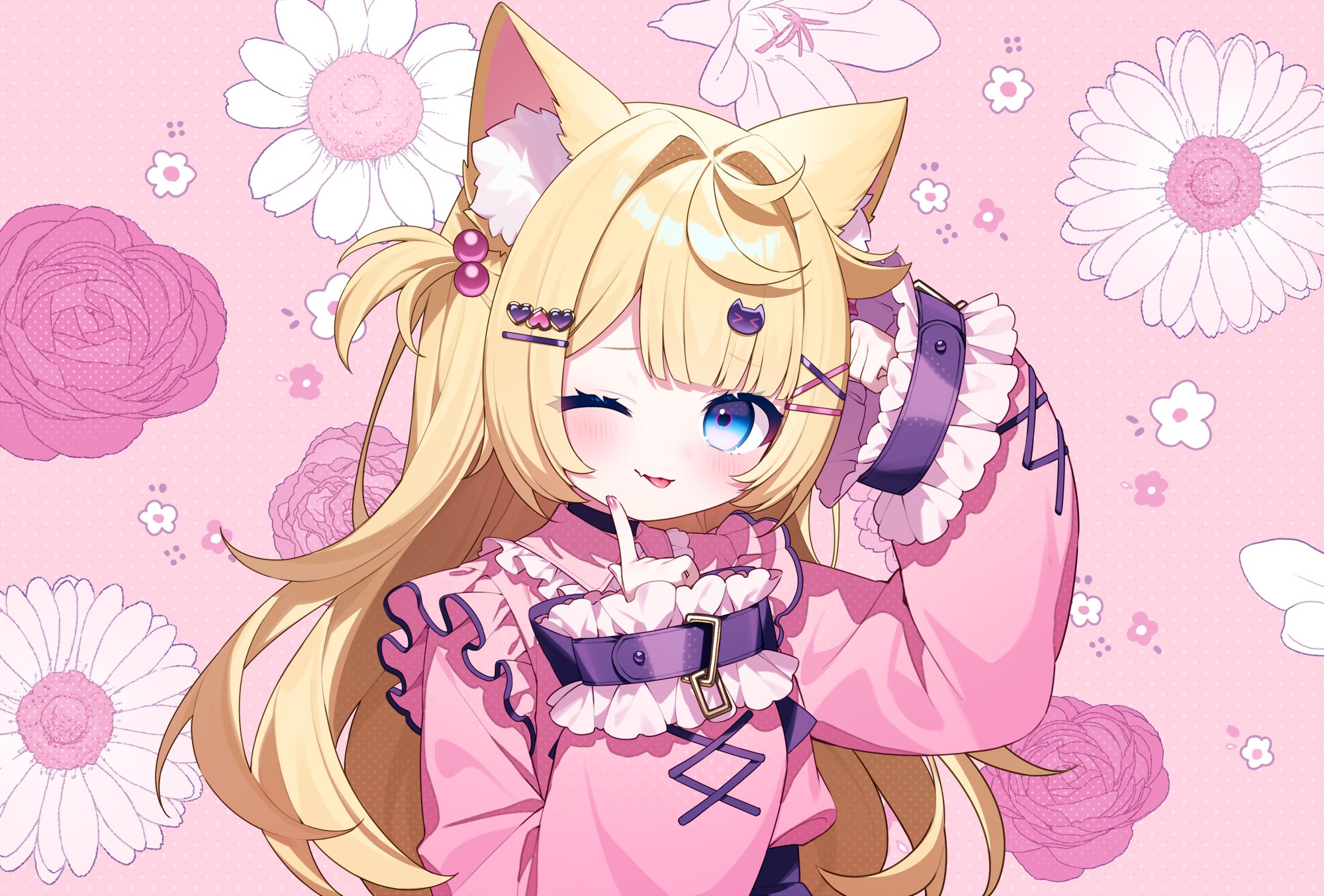1girl animal_ears belt blonde_hair blush cat_ears cat_girl cuemew_(vtuber) ear_fur hazakurachikori indie_virtual_youtuber one_eye_closed pink_backgrounde pink_shirt purple_belt shirt solo tongue tongue_out virtual_youtuber wink