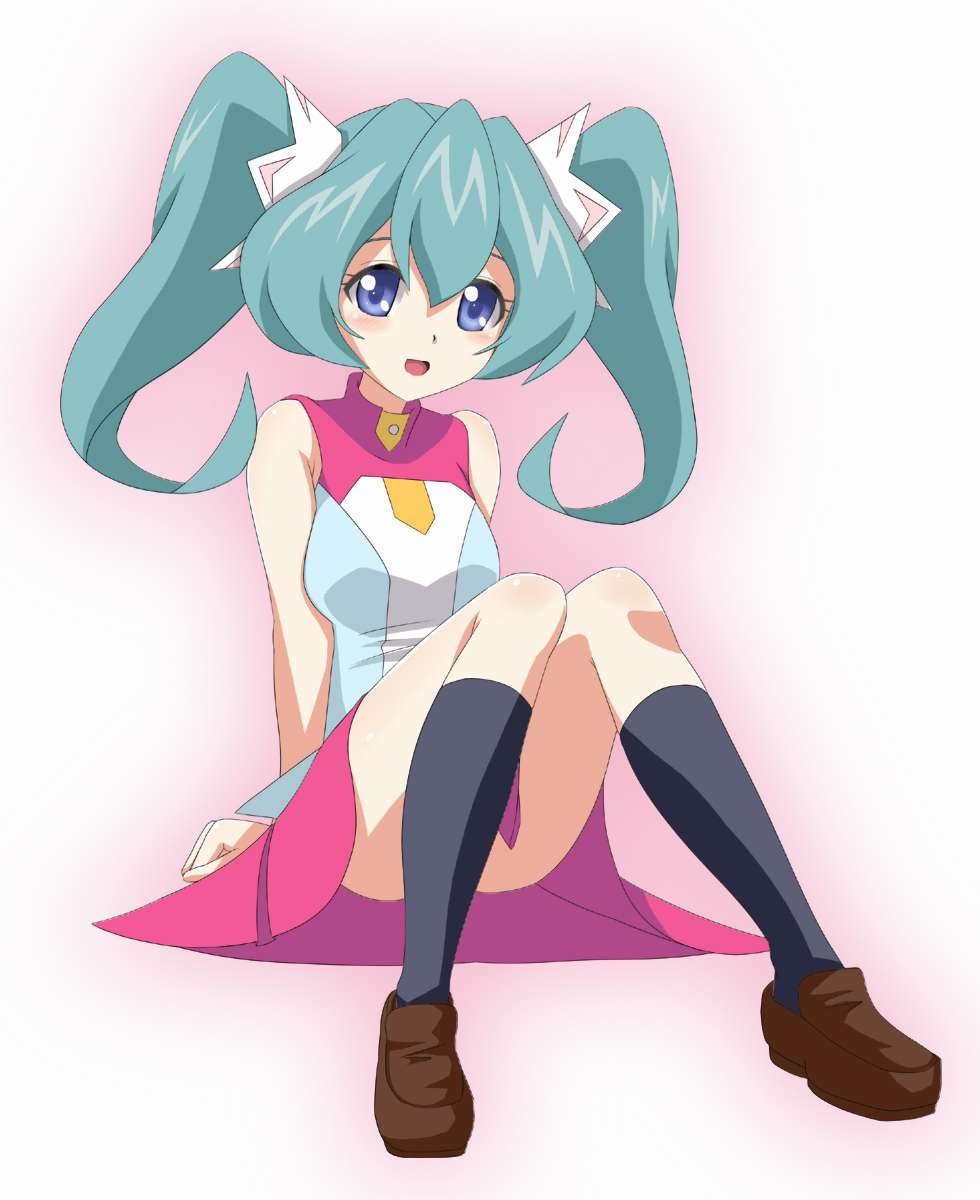 1girl :d aki_(yu-gi-oh!_zexal) black_socks blue_eyes blush brown_shoes commentary_request convenient_leg full_body gradient_background green_hair highres kneehighs knees_up konmo_hissorii loafers miniskirt multicolored_shirt open_mouth pink_skirt pleated_skirt school_uniform shirt shoes sitting skirt sleeveless sleeveless_shirt smile socks solo twintails yu-gi-oh! yu-gi-oh!_zexal