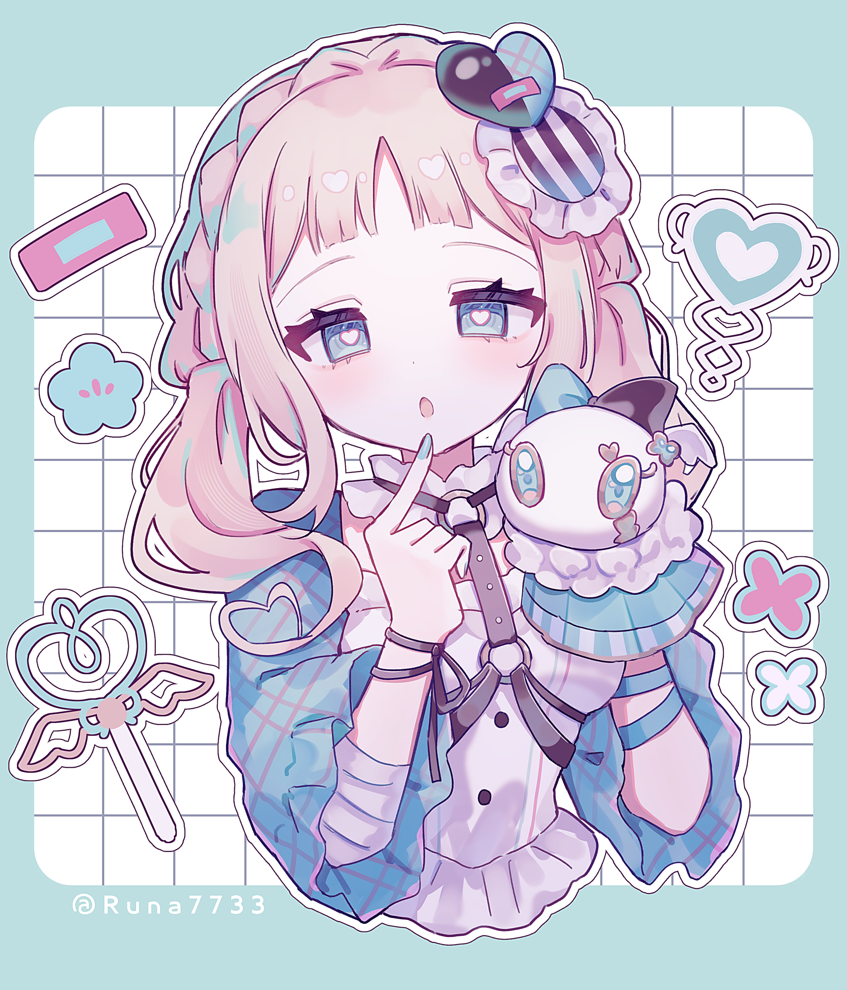 1girl :o absurdres bandaid blonde_hair blue_jacket border commentary_request cropped_torso finger_to_own_chin green_border green_eyes green_hair grid_background hair_ornament haishin_shoujo_no_uraaka_meikyuu hand_puppet harness heart heart-shaped_pupils heart_hair_ornament highres jacket kagura_kuroa looking_at_viewer multicolored_hair outline puppet runa_(runa7733) shirt simple_background solo staff streaked_hair symbol-shaped_pupils twintails twitter_username white_background white_shirt