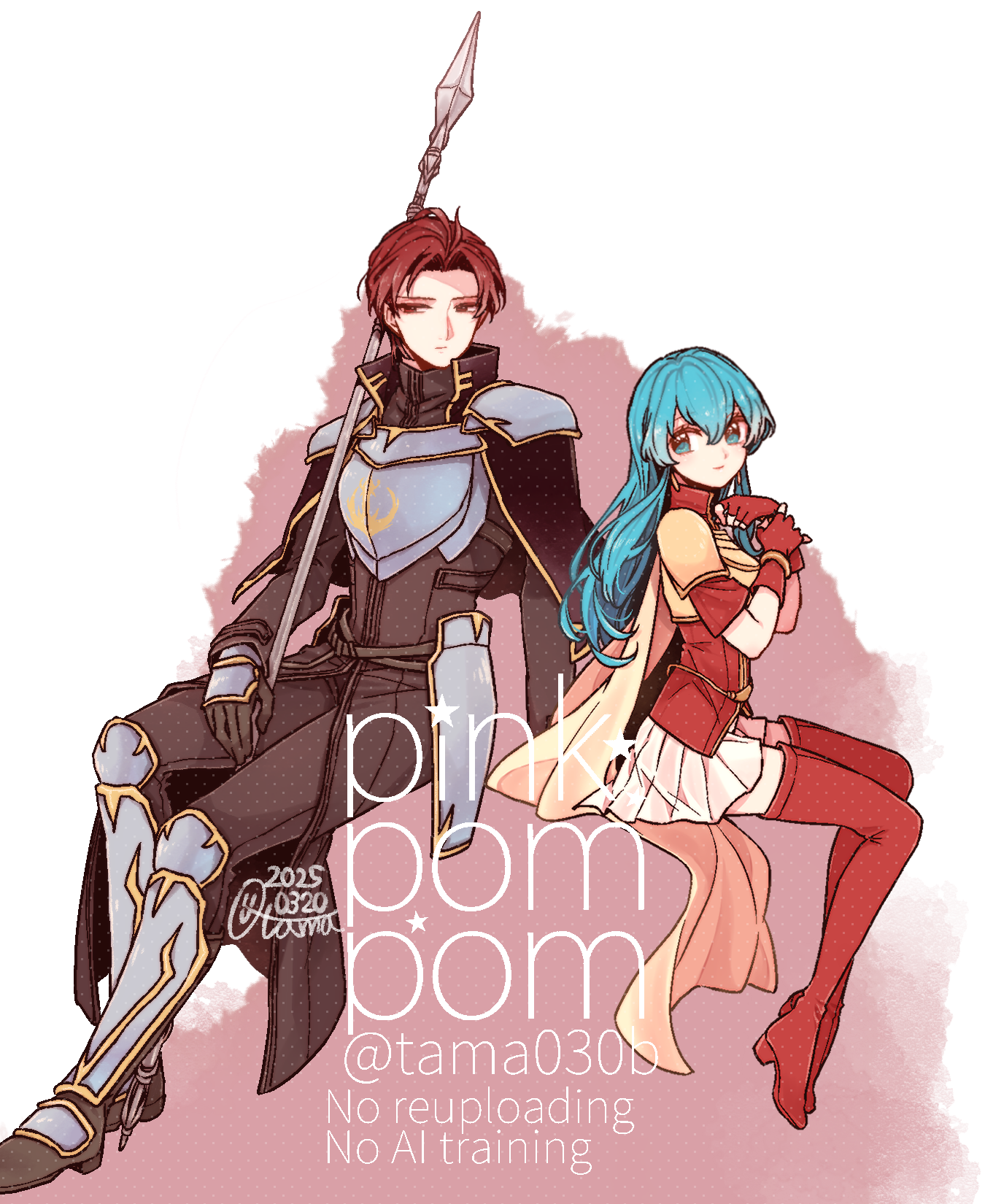 1boy 1girl 2025 aqua_eyes aqua_hair armor black_boots black_capelet black_pants black_shirt boots breastplate breasts cape capelet commentary_request eirika_(fire_emblem) facing_viewer fire_emblem fire_emblem:_the_sacred_stones full_body gloves grey_armor high_collar highres holding holding_polearm holding_weapon invisible_chair long_hair long_sleeves looking_at_viewer looking_to_the_side miniskirt nintendo pants parted_bangs pink_background polearm red_boots red_eyes red_gloves red_hair red_shirt sayu030b seth_(fire_emblem) shirt short_hair short_sleeves shoulder_armor sitting skirt small_breasts spear thigh_boots thighhighs twitter_username two-tone_background watermark weapon white_background white_skirt yellow_armor yellow_cape zettai_ryouiki