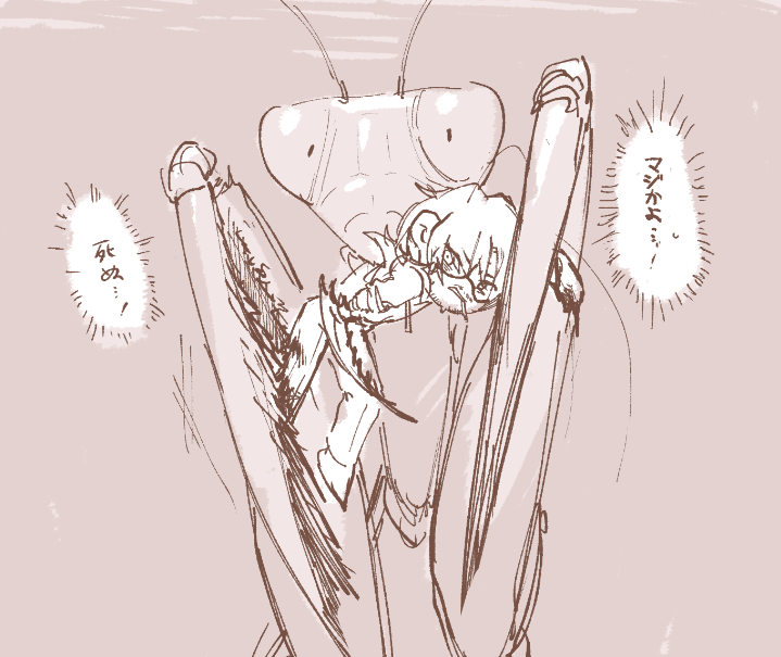 1boy absurdres angry arthropod_limbs beard_stubble bleeding blood bound bug cigarette collared_shirt facial_hair formal_clothes glasses gregor_(project_moon) grey_background greyscale half-closed_eyes highres id_card limbus_company long_hair looking_back low_ponytail male_focus monochrome motion_lines mouth_hold name_tag necktie pants paramecium_nmi parted_bangs photoshop_(medium) ponytail praying_mantis project_moon pun restrained scared semi-rimless_eyewear shirt shoes simple_background sketch sleeves_rolled_up smoking solo_focus speech_bubble struggling stubble under-rim_eyewear vest