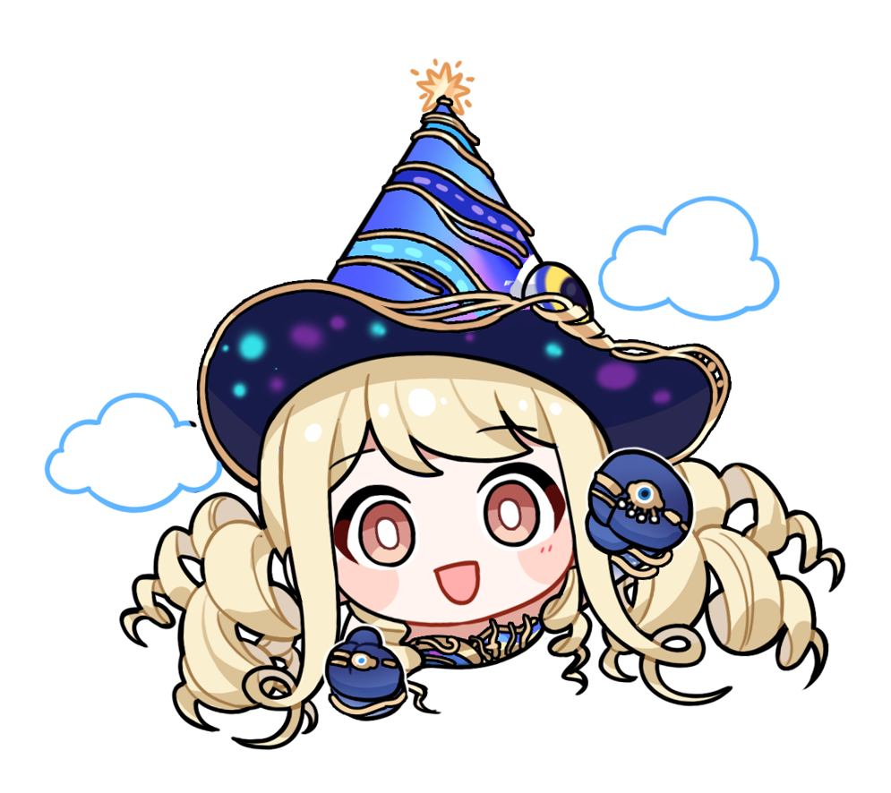 1girl artist_request blonde_hair blue_dress blue_gloves blue_hat blush_stickers bracelet bright_pupils brown_eyes chibi cloud covenant_of_time_(infinity_nikki) cropped_torso disembodied_eye dress drill_hair elbow_gloves fist_pump from_above gloves gold_bracelet gold_ring happy hat hat_ornament hexagram infinity_nikki jewelry long_hair looking_at_viewer low_twintails multiple_bracelets multiple_rings nikki_(series) official_art open_mouth ring ring_on_every_finger smile solo star_(symbol) star_hat_ornament sticker_(medium) strapless strapless_dress striped_clothes striped_headwear swept_bangs tareme transparent_background twintails two-sided_fabric two-sided_headwear white_pupils wizard wizard_hat