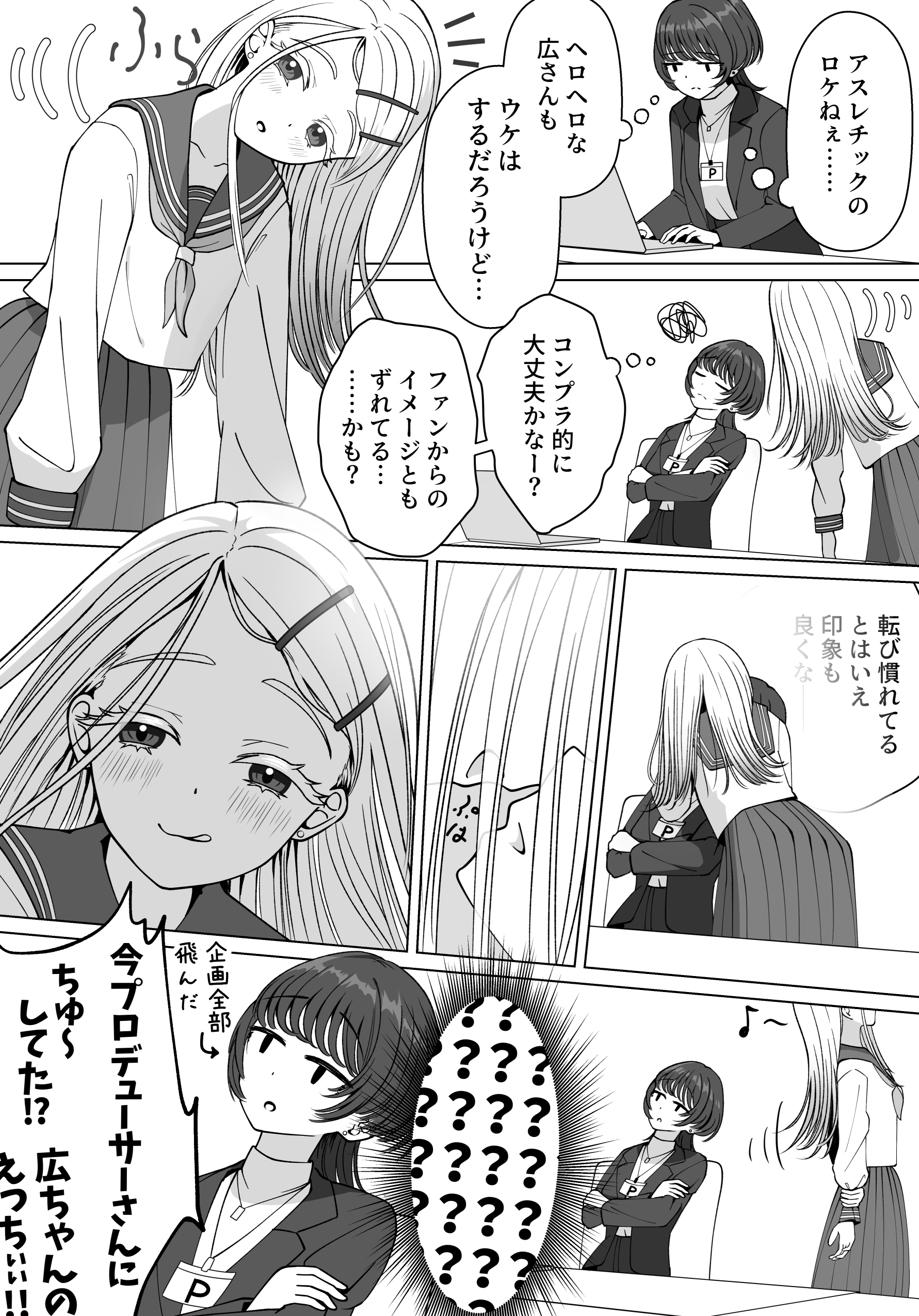 2girls :q ? ?? absurdres blush closed_eyes closed_mouth commentary_request crossed_arms eighth_note female_producer_(idolmaster) gakuen_idolmaster greyscale hair_ornament hairclip highres idolmaster inori_chimera jacket jellyfish_cut jewelry kiss lanyard long_hair long_sleeves monochrome motion_lines multiple_girls musical_note neckerchief necklace open_clothes open_jacket parallel_hairclips pleated_skirt producer_(idolmaster) sailor_collar school_uniform serafuku shinosawa_hiro skirt smile speech_bubble spoken_question_mark squiggle straight_hair stunned_silence suit_jacket surprise_kiss surprised sweater thinking thought_bubble tongue tongue_out translation_request turtleneck turtleneck_sweater yuri