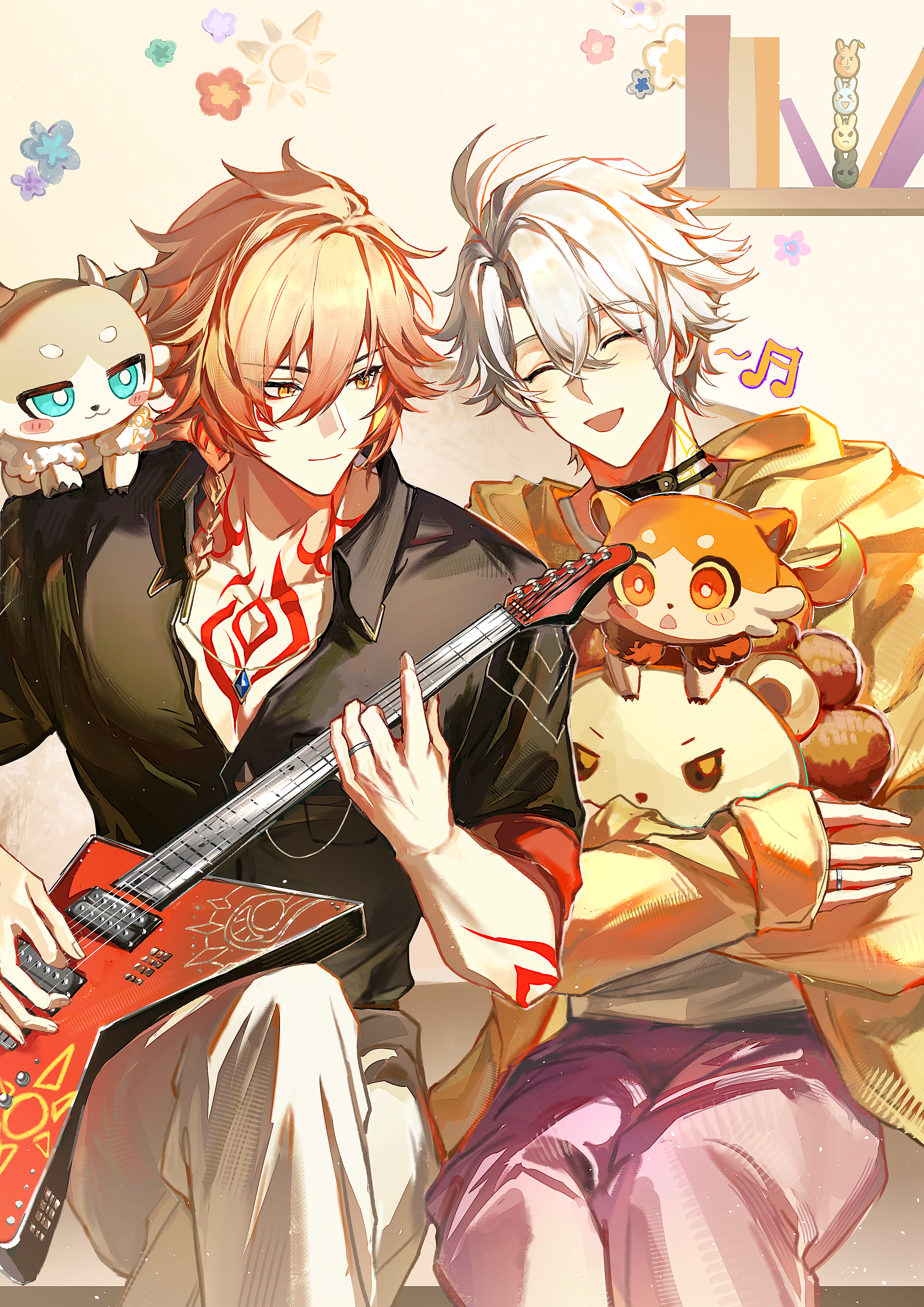 2boys absurdres antenna_hair arm_tattoo black_choker black_shirt blonde_hair braid chest_tattoo chinese_commentary choker closed_eyes collared_shirt commentary_request electric_guitar facial_tattoo gradient_hair guitar highres holding holding_guitar holding_instrument holding_stuffed_toy honkai:_star_rail honkai_(series) hood hood_down hoodie instrument male_focus medium_hair multicolored_hair multiple_boys mydei_(fig_stew)_(honkai:_star_rail) mydei_(hello_world!)_(honkai:_star_rail) mydei_(honkai:_star_rail) neck_tattoo official_alternate_costume pants parted_bangs phainon_(hello_world!)_(honkai:_star_rail) phainon_(honkai:_star_rail) phainon_(vigethos)_(honkai:_star_rail) purple_pants qiaose33912 red_hair red_tattoo shirt short_hair side_braid stuffed_animal stuffed_toy sun_symbol sun_tattoo tan tattoo white_hair white_pants yellow_eyes yellow_hoodie