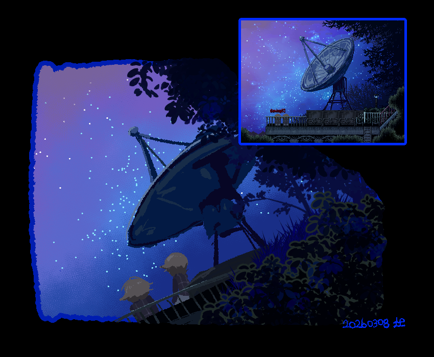 2girls blonde_hair clone commentary dated derivative_work grey_sweater_vest in-universe_location milneh multiple_girls night outdoors photo-referenced plaid_clothes plaid_sweater_vest plaid_vest reference_inset satellite_dish screenshot_inset screenshot_redraw sky star_(sky) starry_sky sweater_vest untranslatable_commentary urotsuki vest yume_2kki