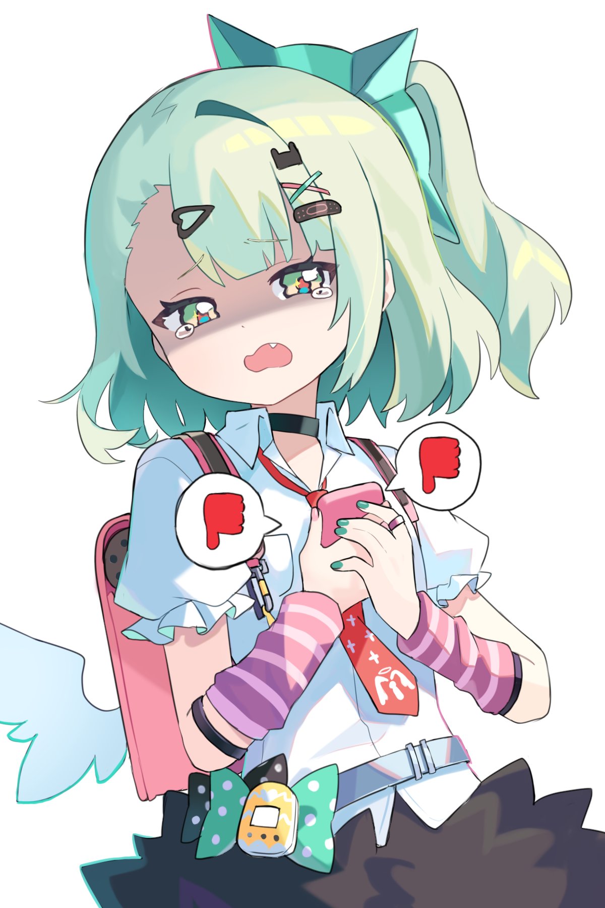 1girl arm_warmers asymmetrical_bangs backpack bag bandaid bandaid_hair_ornament black_choker black_skirt cat_hair_ornament cellphone choker cowboy_shot fang fur-trimmed_skirt fur_trim green_eyes green_hair hair_ornament hands_on_own_chest heart heart_hair_ornament highres holding holding_phone looking_at_viewer medium_hair miyako_draw necktie open_mouth own_hands_together phone pink_arm_warmers pink_bag ponytail randoseru red_necktie sad school_bag shaded_face shirt simple_background single_hair_intake single_sidelock skirt smartphone solo spoken_thumbs_down striped_arm_warmers sunna_(zenless_zone_zero) tearing_up thumbs_down white_background white_shirt x_hair_ornament zenless_zone_zero