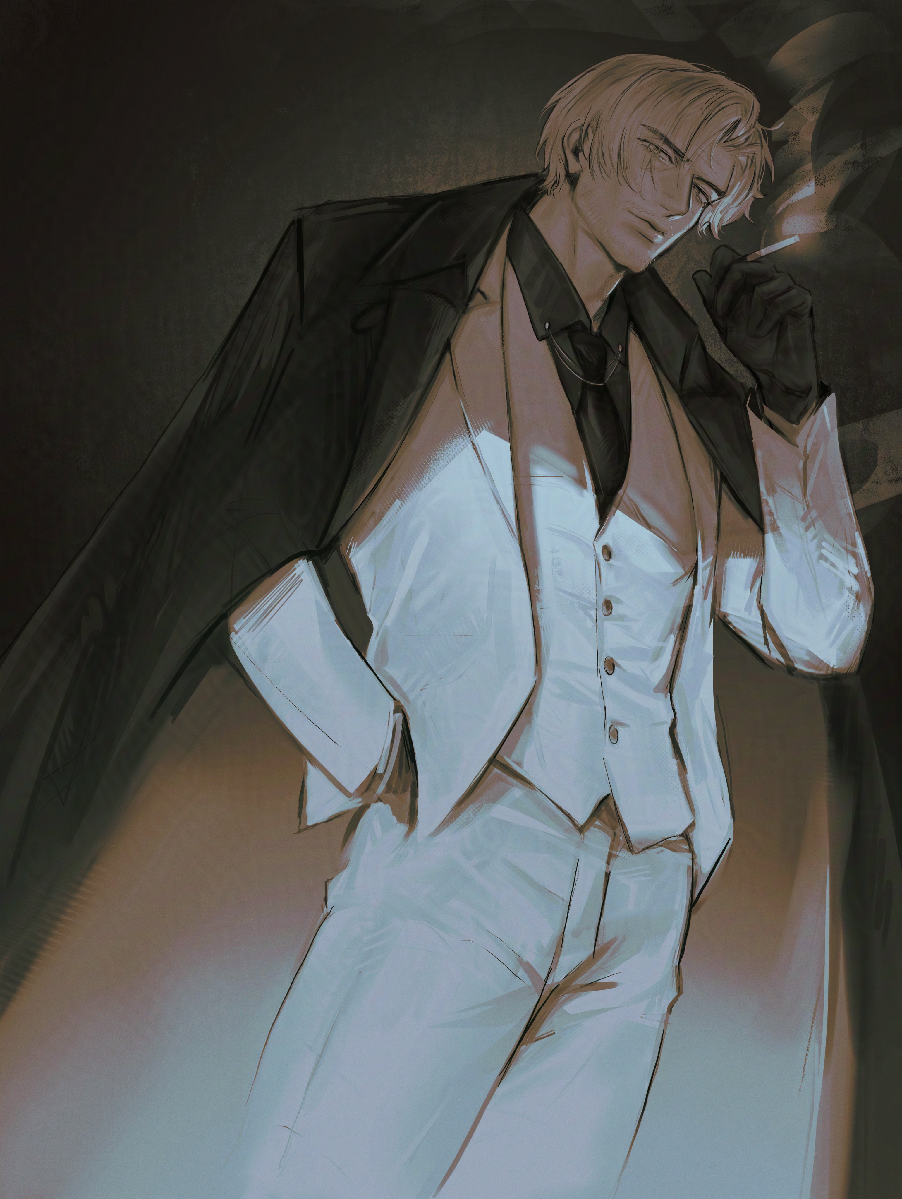 1boy absurdres black_necktie business_suit cigarette commentary curtained_hair english_commentary formal_clothes highres holding holding_cigarette leon_s._kennedy male_focus necktie nokkusuart resident_evil resident_evil_requiem smoking solo suit vest