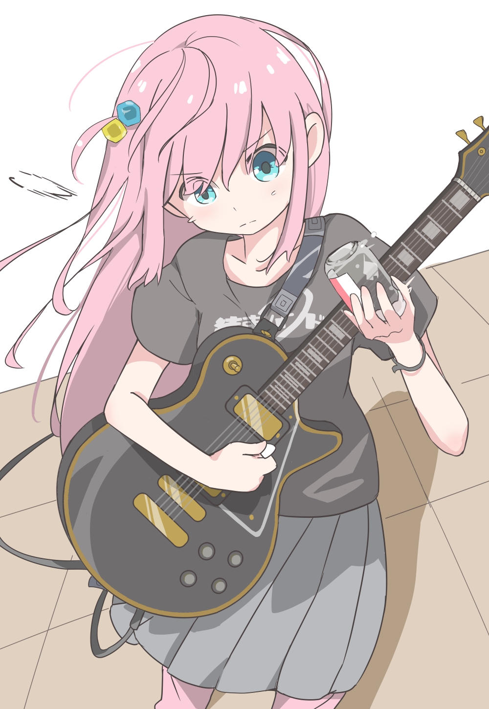 1girl black_shirt bocchi_the_rock! commentary_request cube_hair_ornament electric_guitar gibson_les_paul gotoh_hitori grey_skirt guitar hair_ornament highres holding holding_guitar holding_instrument holding_plectrum instrument kureijii_saiko long_hair music one_side_up pants pants_under_skirt pink_hair pink_pants playing_instrument pleated_skirt plectrum shirt short_sleeves skirt solo sweatpants t-shirt track_pants