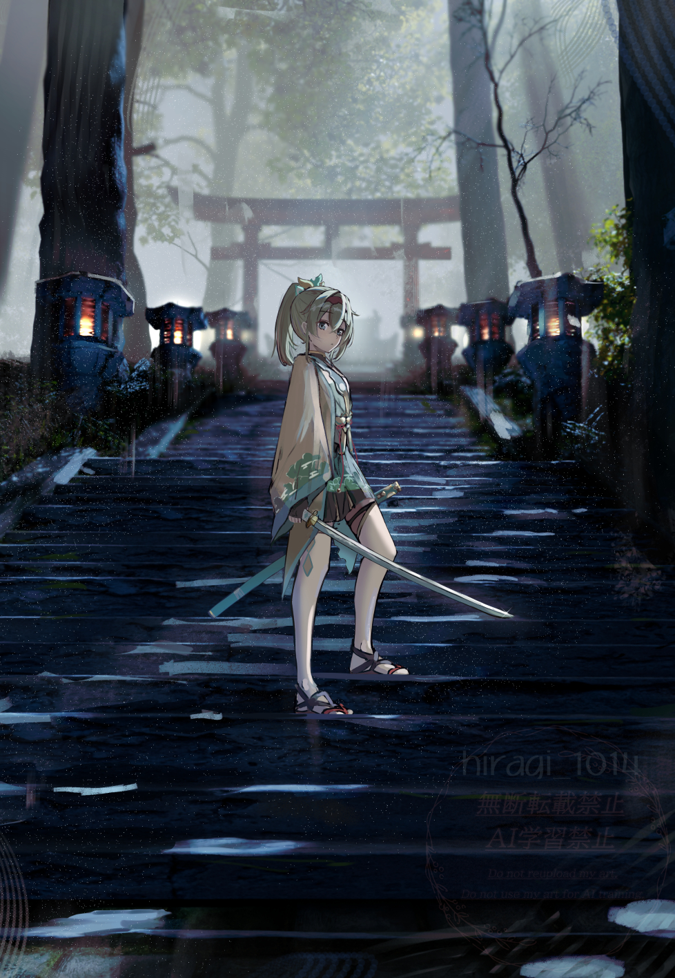 1girl black_gloves black_hairband black_skirt blonde_hair commentary_request fingerless_gloves full_body gloves hairband hakama hakama_short_skirt hakama_skirt haori highres hiragi_1014 holding holding_sword holding_weapon hololive japanese_clothes katana kazama_iroha kazama_iroha_(1st_costume) looking_at_viewer medium_hair outdoors ponytail sandals skirt solo standing sword tabi thighhighs torii virtual_youtuber weapon white_thighhighs wide_sleeves yellow_haori zouri