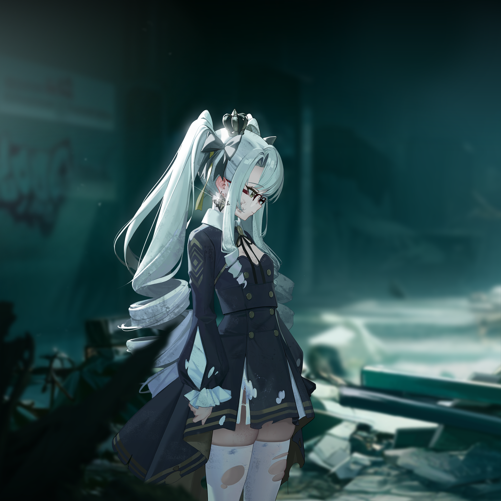 1girl black_bow blurry blurry_background bow breasts closed_mouth crown drill_hair game_cg goddess_of_victory:_nikke hair_bow hair_ribbon highres long_hair looking_down non-web_source official_art parted_bangs princess_(nikke) ribbon semi-rimless_eyewear skindentation skirt small_breasts solo spoilers stain thighhighs torn_clothes torn_thighhighs twin_drills twintails zettai_ryouiki