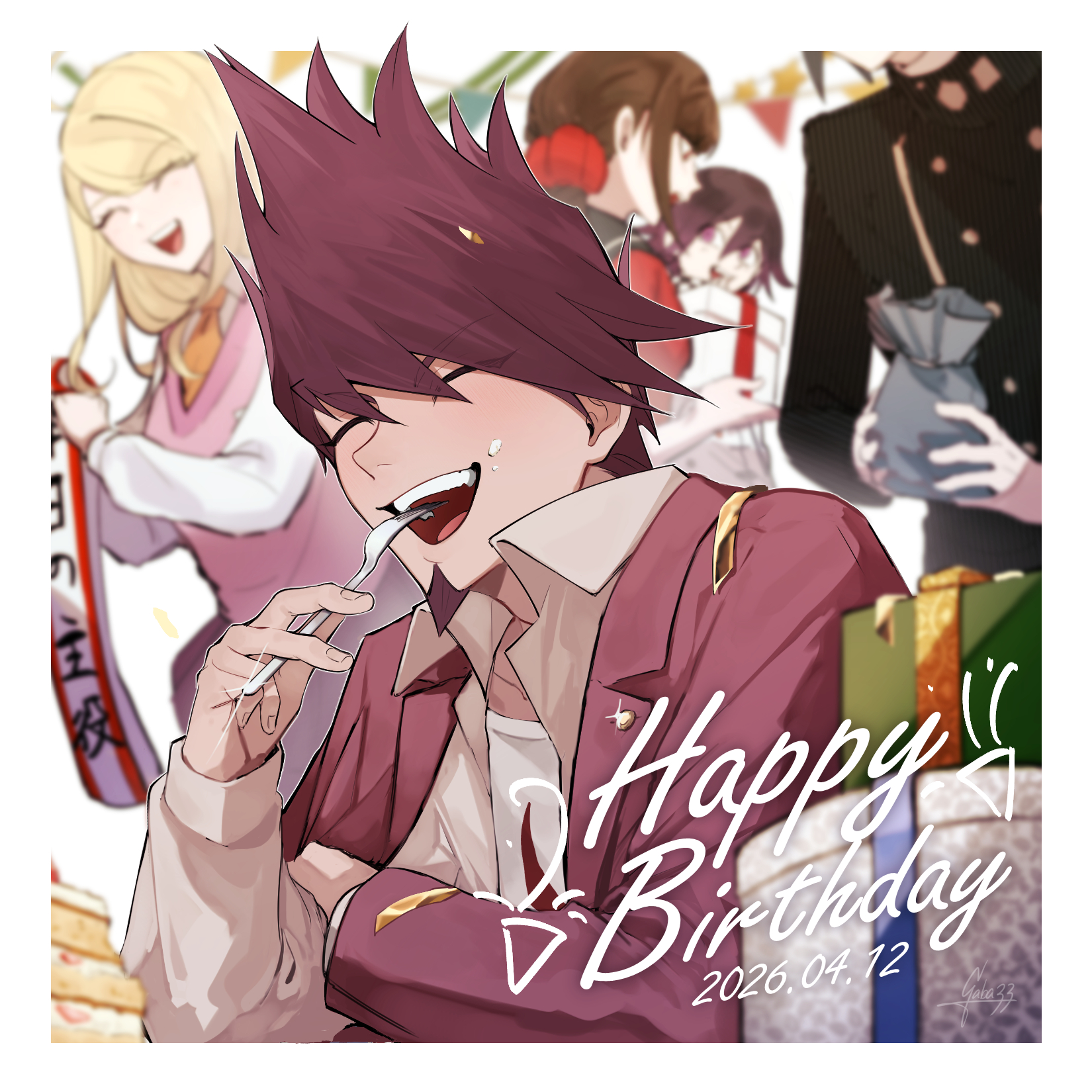 2026 2girls 3boys akamatsu_kaede birthday black_hair blonde_hair border box brown_hair cake closed_eyes collared_jacket commentary danganronpa_(series) danganronpa_v3:_killing_harmony dated eating facial_hair flipped_hair food food_on_face fork gaba33 gift gift_box goatee hair_between_eyes hair_ornament hair_scrunchie happy happy_birthday harukawa_maki highres holding holding_fork holding_gift holding_pouch jacket light_blush long_hair long_sleeves low_twintails male_focus momota_kaito multiple_boys multiple_girls oma_kokichi open_clothes open_mouth purple_eyes purple_facial_hair purple_hair saihara_shuichi scrunchie shirt short_hair smile solo_focus spiked_hair teeth twintails white_border white_shirt