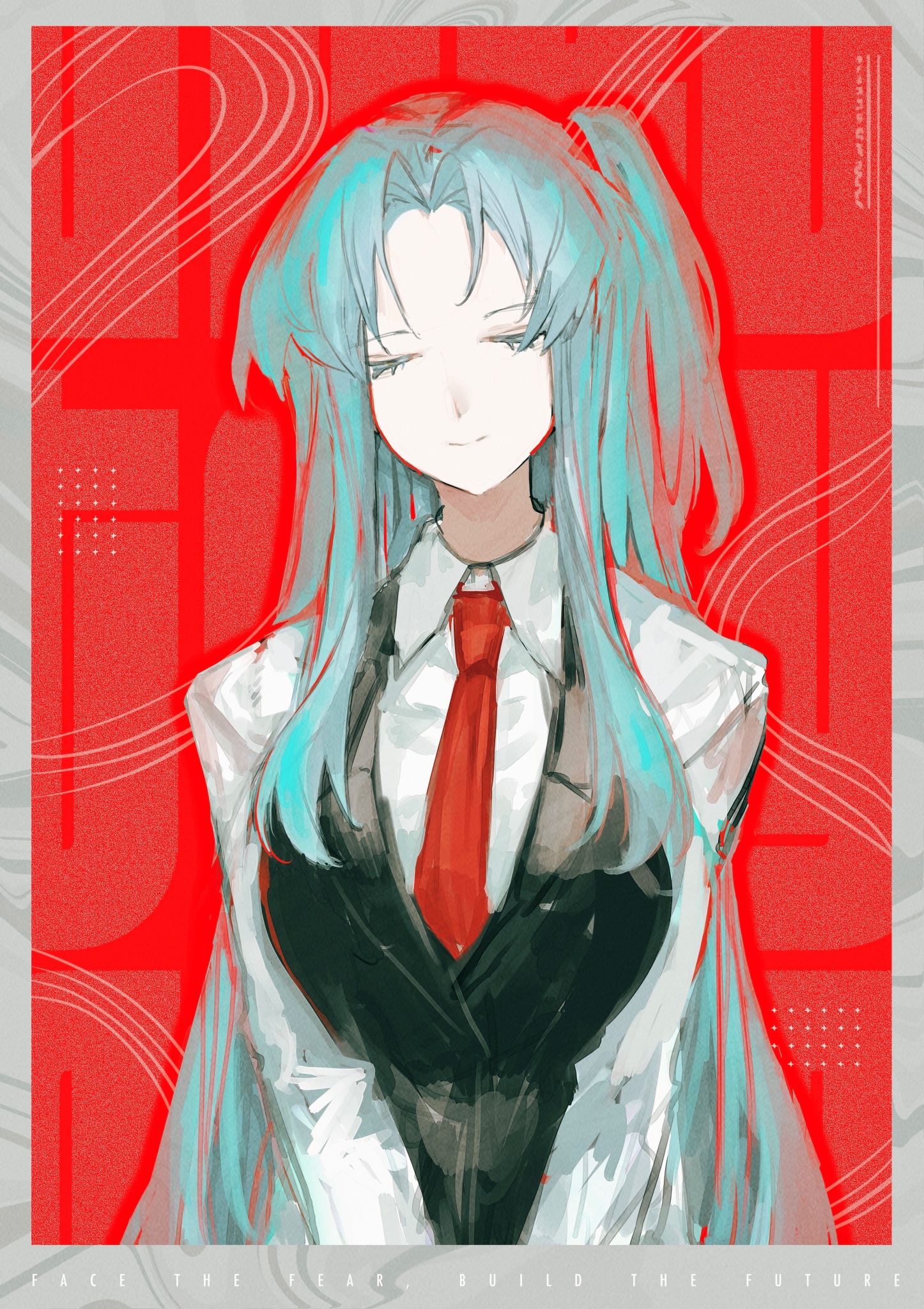 1girl angela_(project_moon) black_vest blue_hair border breasts closed_eyes closed_mouth collared_shirt colored_eyelashes commentary_request cropped_torso formal_clothes grey_border hair_ornament harume_neko highres large_breasts lobotomy_corporation long_hair long_sleeves necktie one_side_up parted_bangs project_moon red_background red_necktie shirt sidelocks smile solo upper_body very_long_hair vest waves white_shirt
