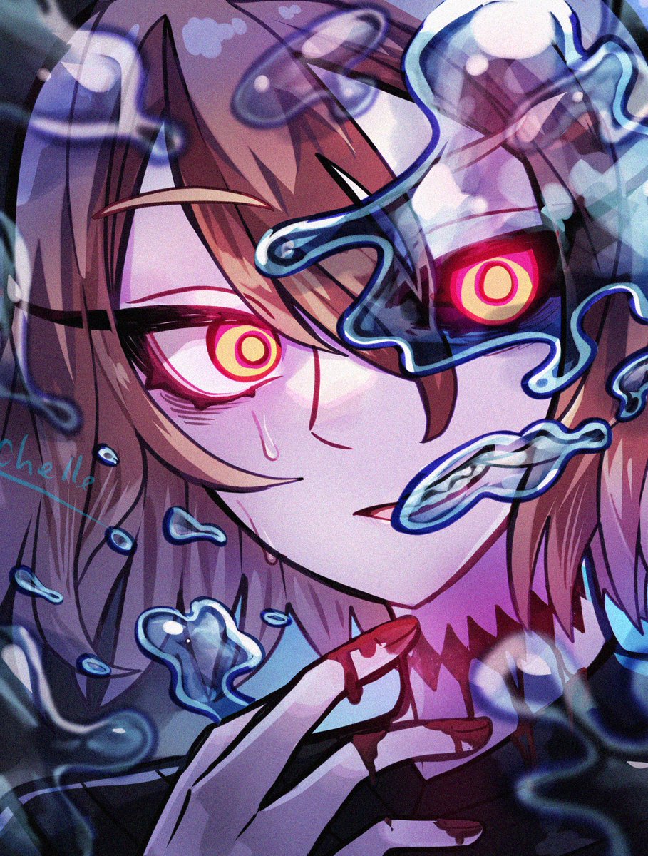 2boys altus_(centuria) arkos_balkar artist_name black_sclera black_tunic bleeding blood blood_on_hands centuria_(manga) chello colored_sclera commentary_request dual_persona evil_grin evil_smile grin highres hydrokinesis long_eyelashes looking_at_viewer magic male_focus multiple_boys orange_eyes orange_hair possessed sharp_teeth smile stitched_neck stitches sweat sweatdrop teeth tunic water