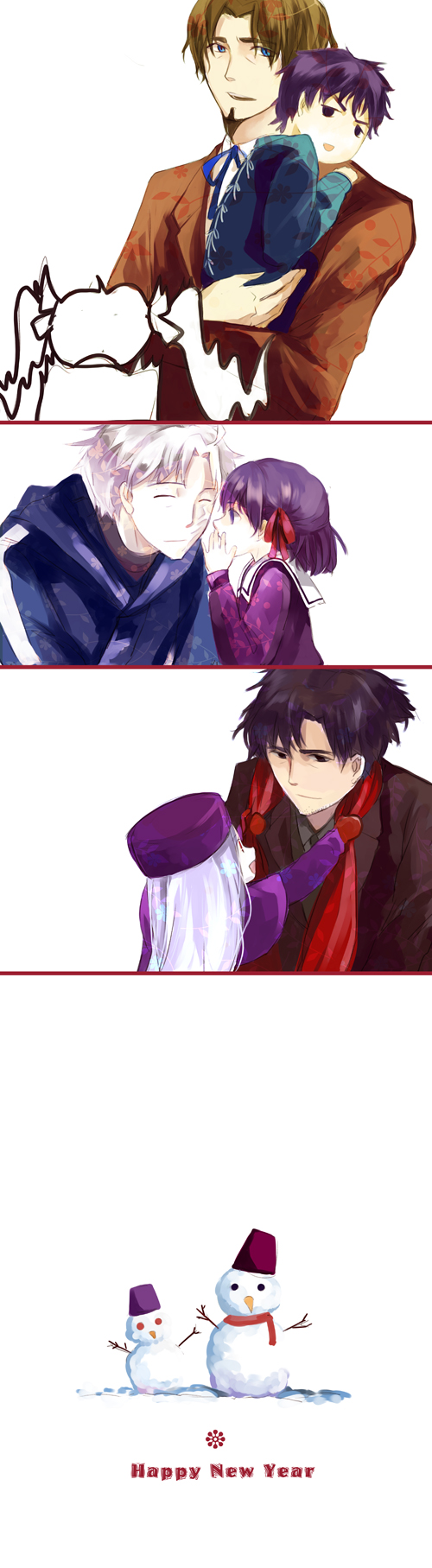 3girls 4boys age_difference age_regression aged_down child emiya_kiritsugu fate/zero fate_(series) father_and_child father_and_daughter hat highres illyasviel_von_einzbern kalalaka kotomine_kirei long_image matou_kariya matou_sakura matou_sakura_(fate/zero) multiple_boys multiple_girls parent_and_child purple_hat red_scarf scarf snowman tall_image tohsaka_rin tohsaka_rin_(fate/zero) tohsaka_tokiomi turn_pale twintails uncle_and_niece