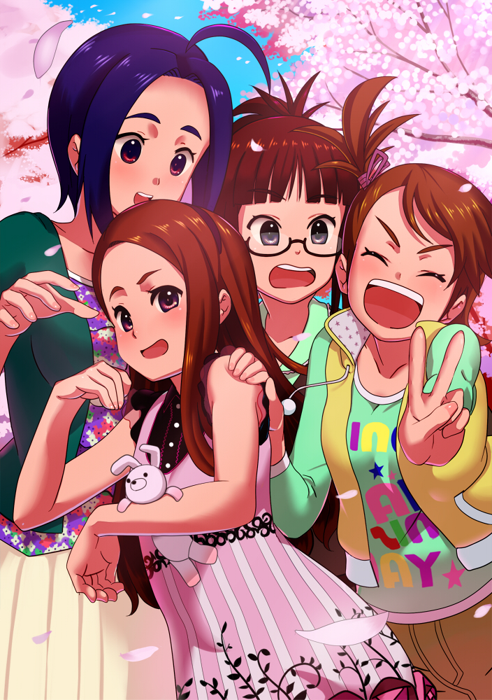 4girls akizuki_ritsuko blush casual cherry_blossoms closed_eyes dress futami_ami hand_on_another's_shoulder idolmaster idolmaster_(classic) looking_at_another looking_at_viewer minase_iori miura_azusa multiple_girls open_mouth petals pettan_p ryuuguu_komachi smile tree upper_body v