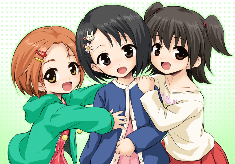 10s 3girls :d akagi_miria black_eyes black_hair brown_eyes brown_hair cardigan child dress girl_sandwich hair_ornament hairclip hand_on_another's_shoulder idolmaster idolmaster_cinderella_girls marugoshi_(54burger) multiple_girls open_mouth rabbit_hair_ornament ryuzaki_kaoru sandwiched sasaki_chie short_hair smile twintails two_side_up
