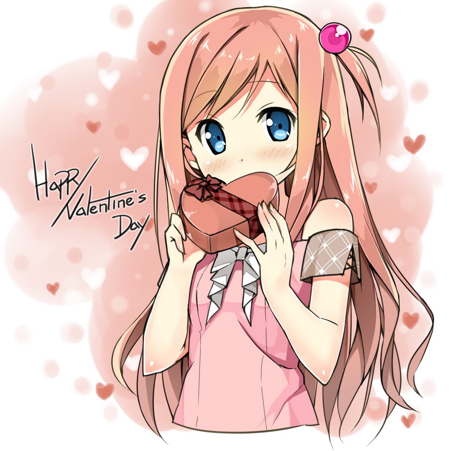 1girl bare_shoulders blue_eyes blush bow box brown_hair casual covering_own_mouth female_focus gift hair_bobbles hair_ornament happy_valentine heart heart-shaped_box kantoku_(style) kudou_naka long_hair looking_at_viewer one_side_up original pink_hair ribbon sky-freedom solo upper_body valentine
