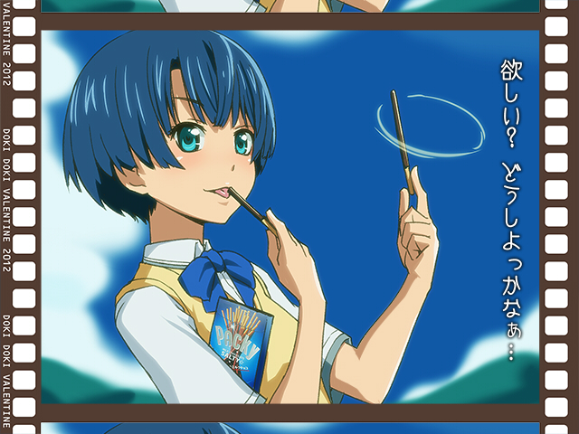 10s 1girl ano_natsu_de_matteru blue_eyes blue_hair day eating female_focus food open_mouth pocky school_uniform short_hair sky solo sutein tanigawa_kanna translation_request