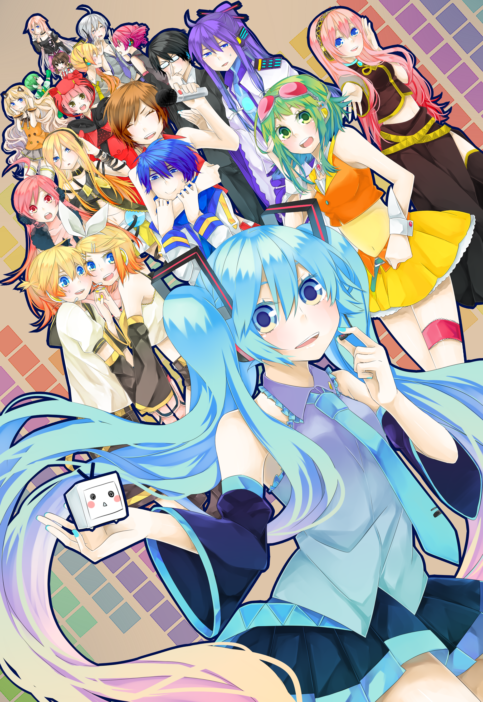 5boys 6+girls absurdres ahoge akita_neru anger_vein aqua_eyes aqua_hair black_hair blonde_hair blue_eyes blue_hair brown_hair crossover detached_sleeves everyone goggles goggles_on_head green_eyes green_hair gumi hair_ornament hair_ribbon hairclip hatsune_miku headphones highres hiyama_kiyoteru ia_(vocaloid) kaai_yuki kagamine_len kagamine_rin kaito_(vocaloid) kamui_gakupo kasane_teto lily_(vocaloid) long_hair looking_at_viewer megurine_luka meiko_(vocaloid) microphone multiple_boys multiple_girls necktie nekomura_iroha niconico open_mouth pineapple_(a30930s) pink_hair red_eyes ribbon ryuuto_(vocaloid) seeu sf-a2_miki short_hair skirt smile thigh_strap twintails utau very_long_hair vocaloid white_hair yowane_haku