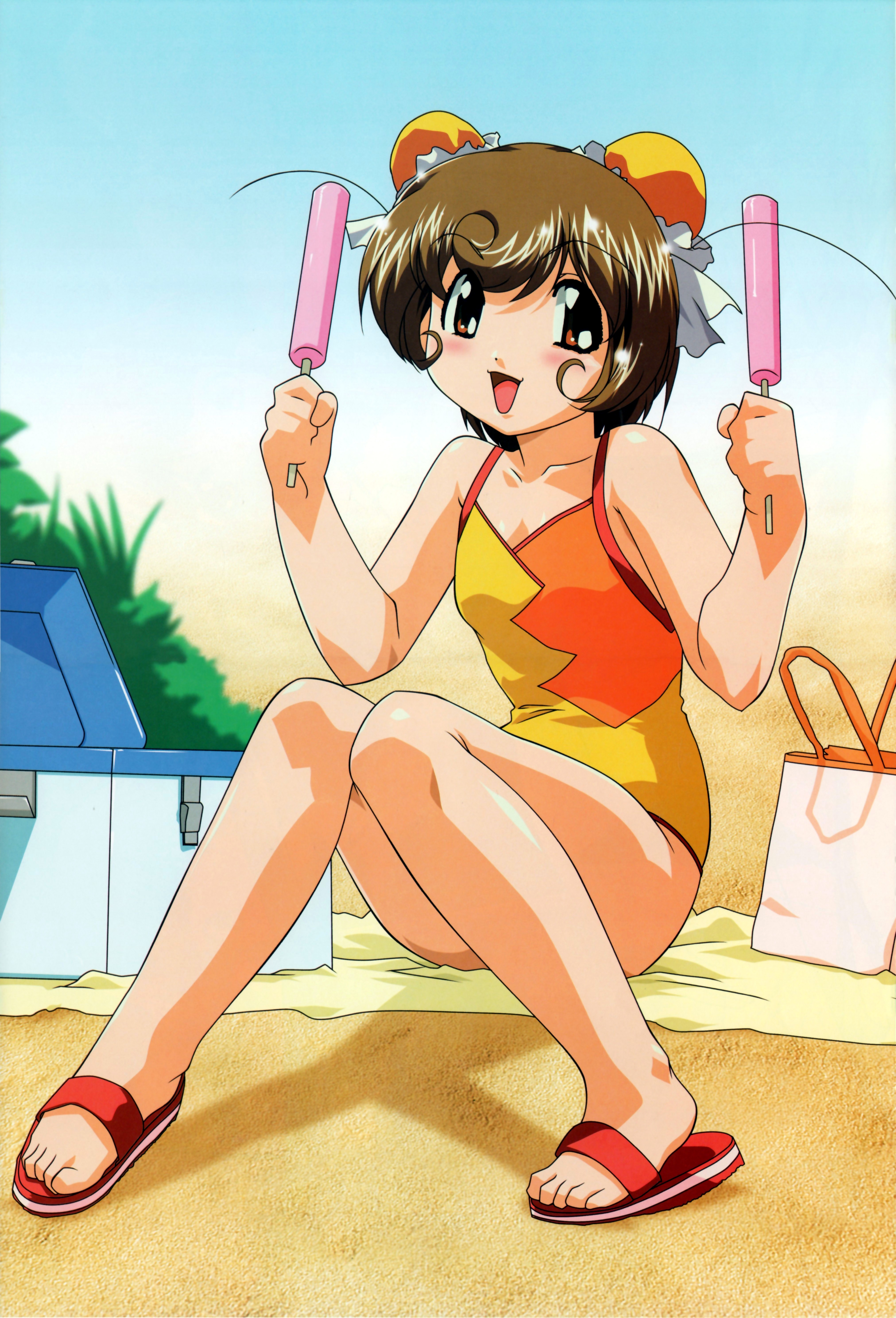 00s 1girl absurdres bag beach beach_towel brown_eyes brown_hair bun_cover cooler double_bun food hair_bun hamster_no_kurumi highres kobayashi_takashi open_mouth popsicle sandals sitting swimsuit tenshi_no_shippo towel