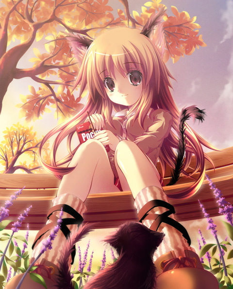 animal_ears autumn cat cat_ears cat_tail duplicate food long_hair original pocky solo tail yamamoto_nori