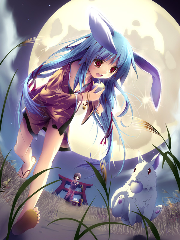 2girls animal_ears blue_hair eating feet food full_moon japanese_clothes kimono legs mochi moon multiple_girls original rabbit rabbit_ears red_eyes sandals toes torii wagashi yamamoto_nori yukata zouri