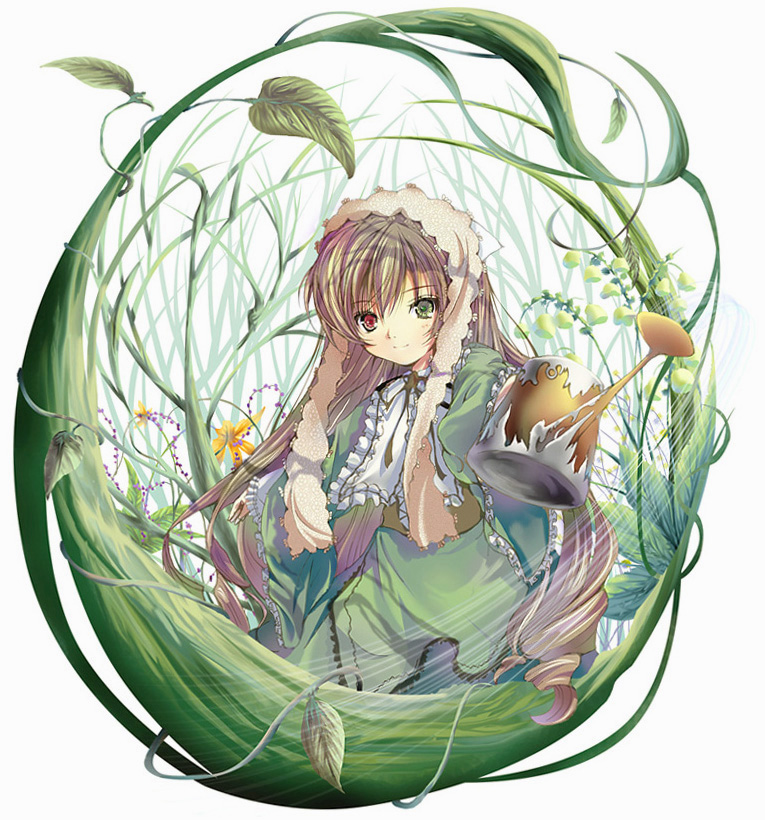 00s 1girl black_ribbon brown_hair character_name closed_mouth corset dress english_text female_focus foreshortening frilled_sleeves frills green_dress green_eyes headscarf headset heterochromia holding leaf long_hair long_sleeves looking_at_viewer maid outstretched_arm plant red_eyes ribbon rozen_maiden simple_background smile solo suiseiseki upper_body vines watering_can white_background white_headscarf wide_sleeves yamamoto_nori