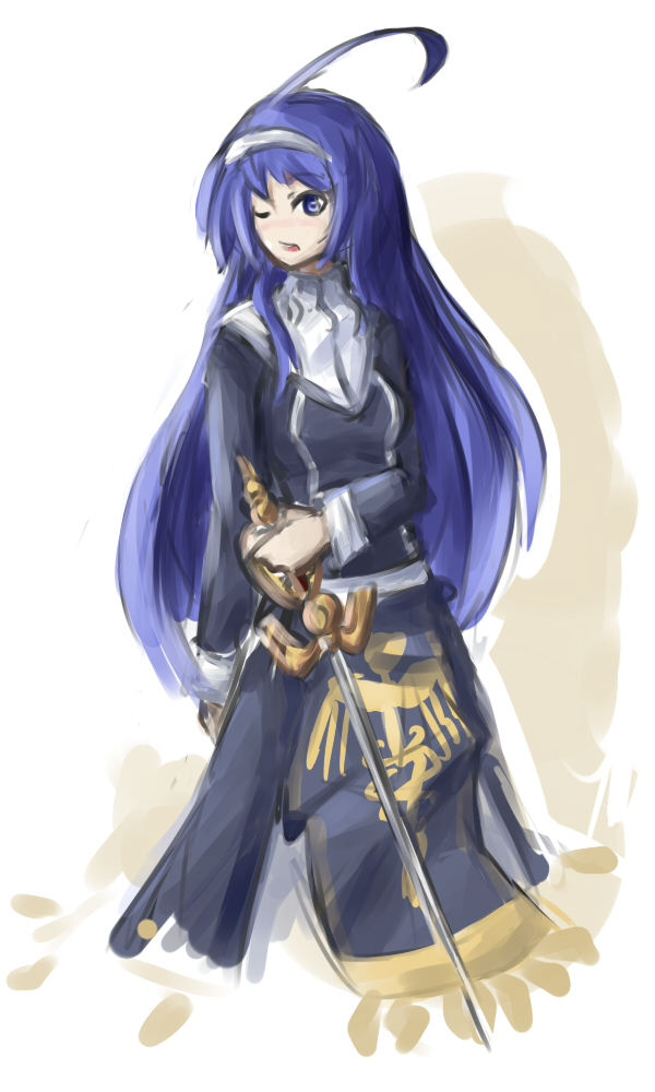 1girl ahoge arceonn blue_eyes blue_hair blush drawfag dress hairband huge_ahoge long_hair looking_at_viewer non-web_source one_eye_closed open_mouth orie_ballardiae_harada rapier reverse_grip simple_background sword under_night_in-birth weapon white_background wink