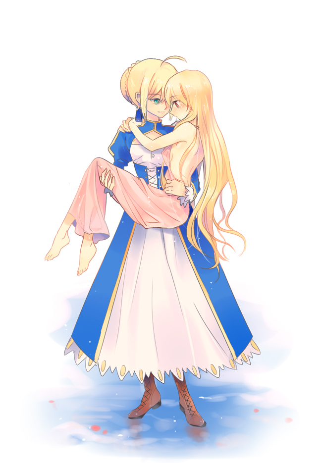 2girls ahoge alternate_costume arnoul artoria_pendragon_(fate) bad_id bad_pixiv_id barefoot blonde_hair blue_eyes blush boots breasts capri_pants carrying cleavage_cutout clothing_cutout corset dress fate/stay_night fate/zero fate_(series) full_body genderswap genderswap_(mtf) gilgamesh-ko gilgamesh_(fate) green_eyes hair_bun hair_ribbon lace-up_boots long_dress long_hair medium_breasts multiple_girls pants princess_carry red_eyes ribbon saber_(fate) short_hair sideboob simple_background single_hair_bun small_breasts smile very_long_hair white_background yuri