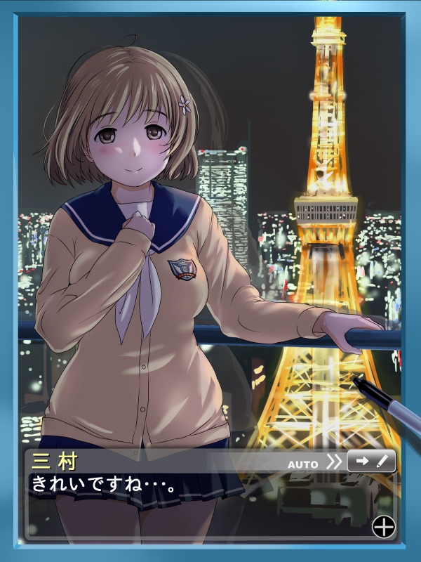 1girl anegasaki_nene anegasaki_nene_(cosplay) bad_id bad_pixiv_id blush breasts brown_eyes brown_hair cardigan cityscape cosplay fake_screenshot female_focus flower hair_flower hair_ornament idolmaster idolmaster_cinderella_girls large_breasts love_plus mimura_kanako parody poponpin reflection school_uniform serafuku short_hair skirt smile solo tokyo_tower