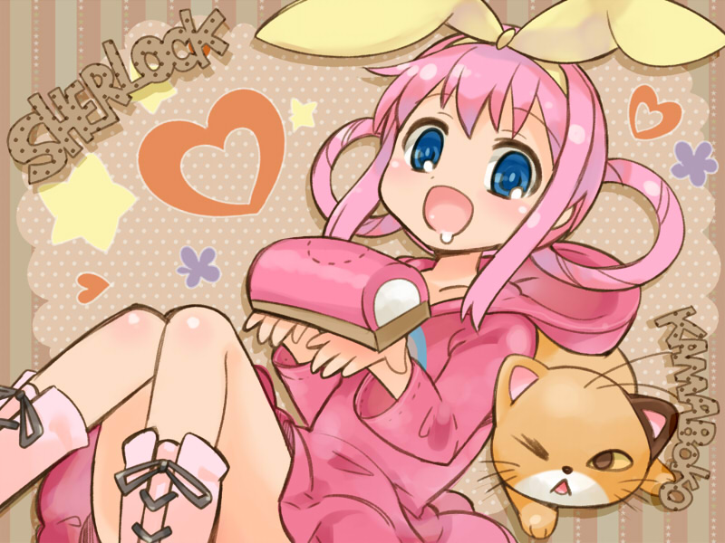 10s 1girl blue_eyes cat drooling female_focus food hair_rings heart kamaboko kamaboko_(milky_holmes) kamaboko_red open_mouth pink_hair pun saliva sherlock_shellingford solo tantei_opera_milky_holmes wince