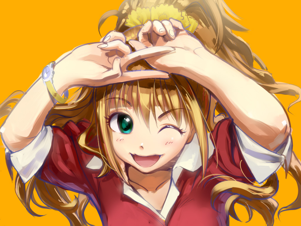 10s 1girl andou_shuki blush female_focus hair_spread_out hino_akane_(idolmaster) idolmaster idolmaster_cinderella_girls one_eye_closed orange_background simple_background smile solo v watch wink wristwatch