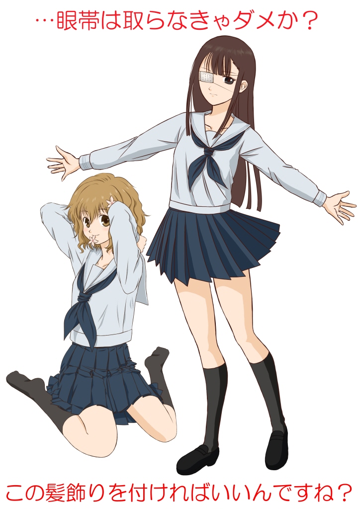 2girls adjusting_hair brown_hair cosplay flower hair_flower hair_ornament hanasaku_iroha haruno_kotori jun_(studioask) kita_e long_hair look-alike matsumae_ohana matsumae_ohana_(cosplay) mouth_hold multiple_girls outstretched_arms pleated_skirt sailor_collar sakyou_hayaka school_uniform short_hair sitting skirt socks spread_arms translation_request tsurugi_minko tsurugi_minko_(cosplay) wariza wavy_hair