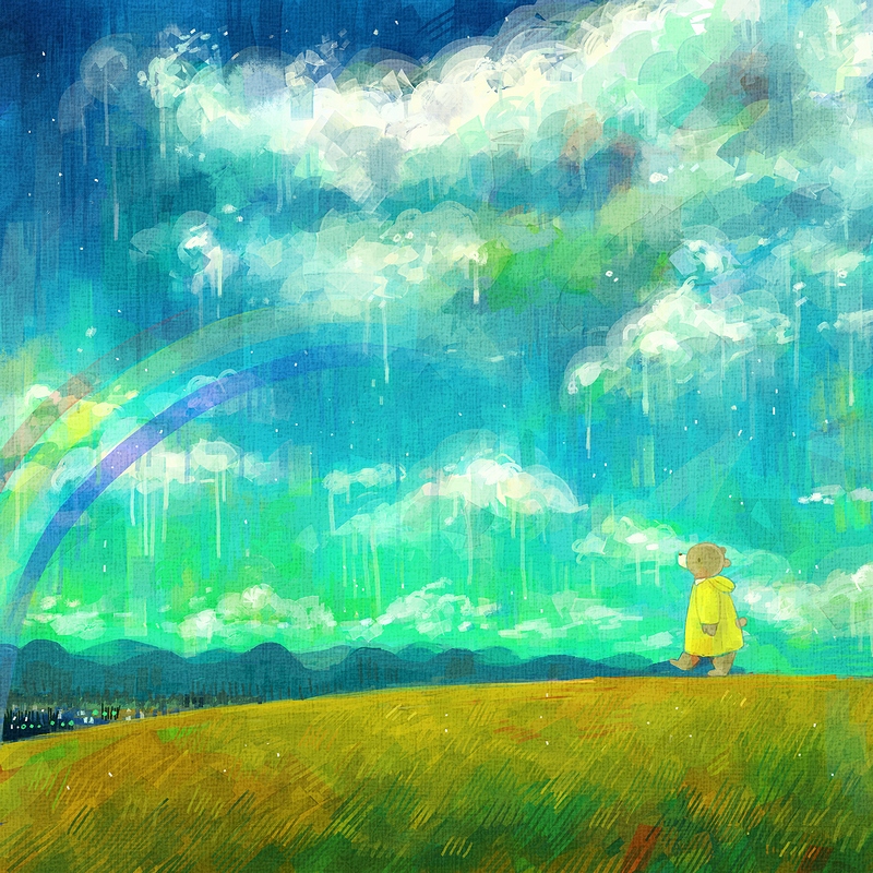 abstract bad_id bad_pixiv_id bear cloud grass landscape no_humans nomiya nomiya_(no_38) original rainbow raincoat scenery sky solo walking