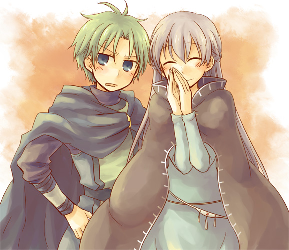 1boy 1girl belly_chain blue_dress blue_eyes blush cape child cloak closed_eyes dress fire_emblem fire_emblem:_the_binding_blade green_eyes green_hair jewelry long_hair nintendo open_mouth own_hands_together purple_eyes purple_hair raigh_(fire_emblem) serina_ranshi short_hair simple_background smile sophia_(fire_emblem) very_long_hair