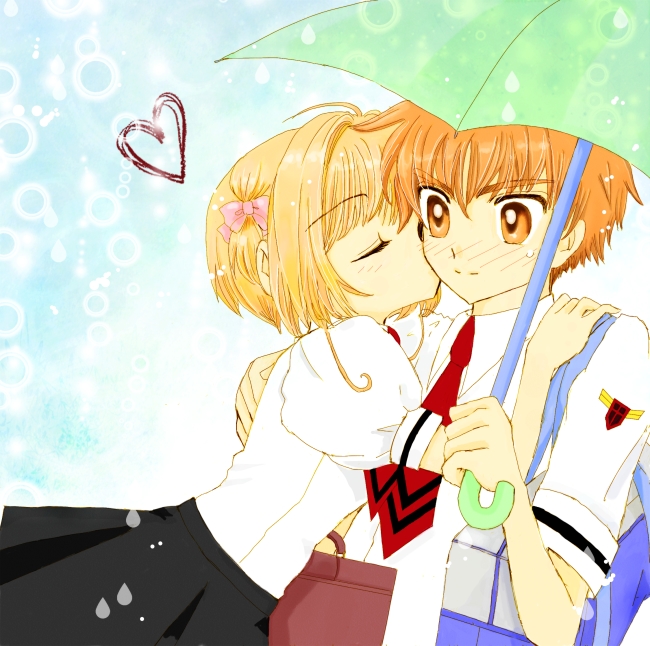 1234suzuran 1990s_(style) 1boy 1girl aged_up bad_id bad_pixiv_id brown_eyes brown_hair cardcaptor_sakura child choko_(cosi_cosi) closed_eyes couple hetero holding holding_umbrella kinomoto_sakura kiss li_syaoran retro_artstyle school_uniform short_hair tomoeda_middle_school_uniform umbrella
